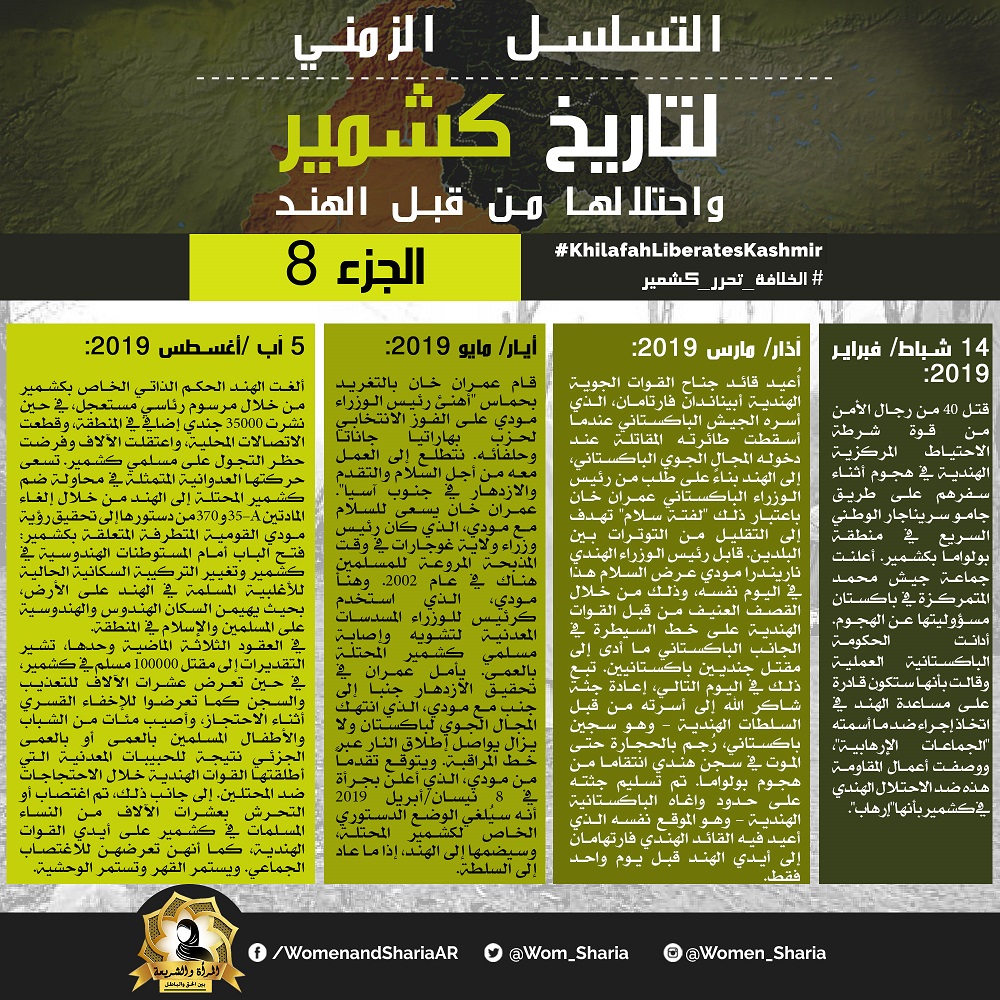 يسر المكتب الإعلامي المركزي لحزب التحرير أن يقدم لمتابعي وزوار مواقعه وصفحاته سلسلة صورية بعنوان "التسلسل الزمني لتاريخ كشمير واحتلالها من قبل الهند" من إعداد القسم النسائي لحزب التحرير في المكتب الإعلامي المركزي لحزب التحرير، وذلك مشاركة منهن في الحملة العالمية التي أطلقها المكتب الإعلامي المركزي بعنوان "لا حل لكشمير إلا بتحريك جيوش المسلمين لتحريرها".