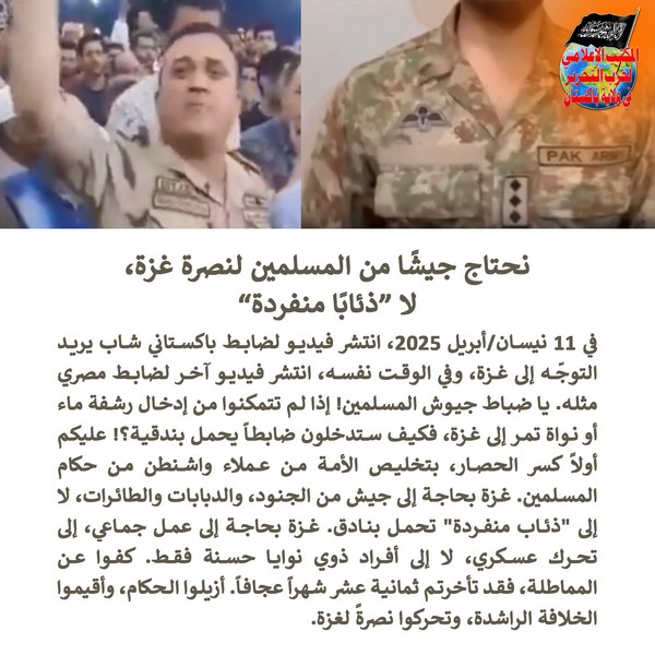 في 11 نيسان/أبريل 2025، انتشر فيديو لضابط باكستاني شاب يريد التوجّه إلى غزة، وفي الوقت نفسه، انتشر فيديو آخر لضابط مصري مثله. يا ضباط جيوش المسلمين! إذا لم تتمكنوا من إدخال رشفة ماء أو نواة تمر إلى غزة، فكيف ستدخلون ضابطاً يحمل بندقية؟! عليكم أولاً كسر الحصار، بتخليص الأمة من عملاء واشنطن من حكام المسلمين. غزة بحاجة إلى جيش من الجنود، والدبابات والطائرات، لا إلى "ذئاب منفردة" تحمل بنادق. غزة بحاجة إلى عمل جماعي، إلى تحرك عسكري، لا إلى أفراد ذوي نوايا حسنة فقط. كفوا عن المماطلة، فقد تأخرتم ثمانية عشر شهراً عجافاً. أزيلوا الحكام، وأقيموا الخلافة الراشدة، وتحركوا نصرةً لغزة.