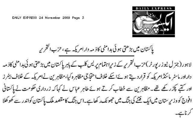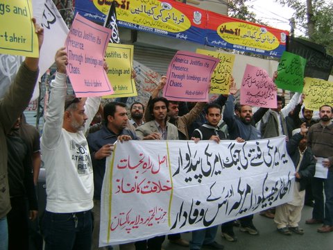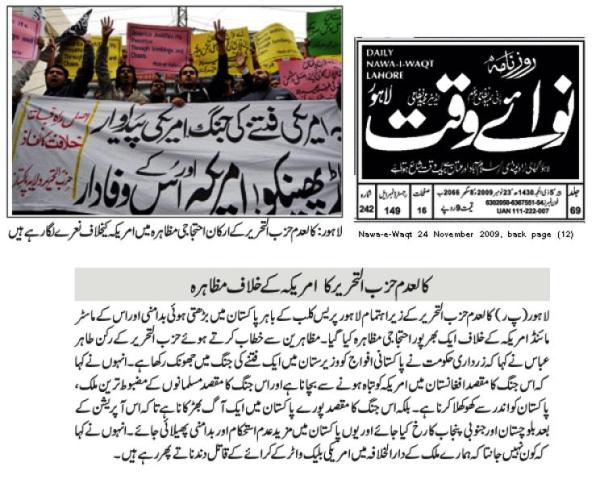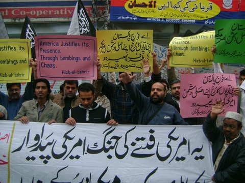 نظم حزب التحرير في 22/11/2009 في مدينة لاهور مظاهرة للتنديد بالوجود الأمريكي في باكستان والذي اوجد حالة الفوضى فيها، كما أدانوا تضحيات الجنود الباكستانيون في سبيل إنقاذ الحملة الصليبية الأمريكية في أفغانستان. حمل المتظاهرون يافطة رئيسية كتب عليها (هذه الحرب "الفتنة" من صنع أمريكا- اركلوا الوجود الأمريكي واخلعوا الحكام العملاء- إقامة الخلافة السبيل الوحيد للتحرير) . كما دعا المتظاهرون الناس للإطاحة بالحكام الذين يقايضون دماء المسلمين بالدولارات، ودعوا الجيش الباكستاني إلى كنس الوجود الأمريكي من المنطقة.