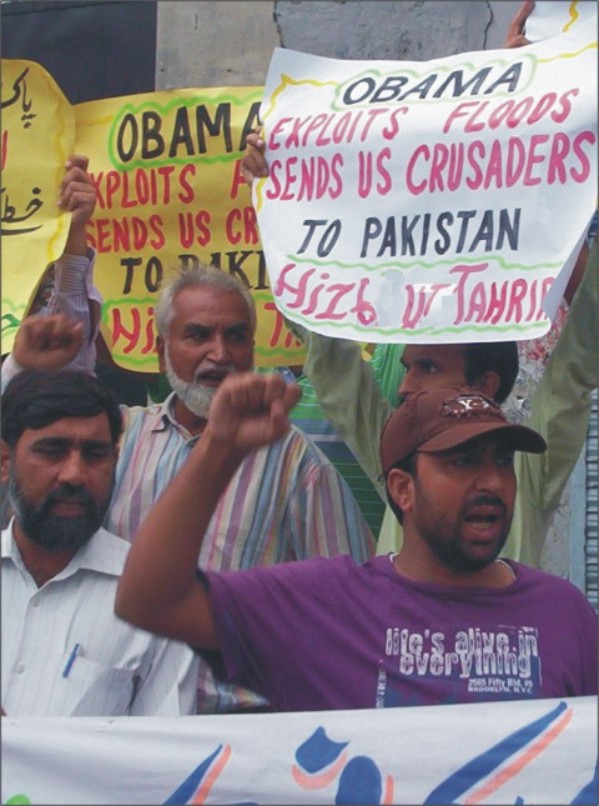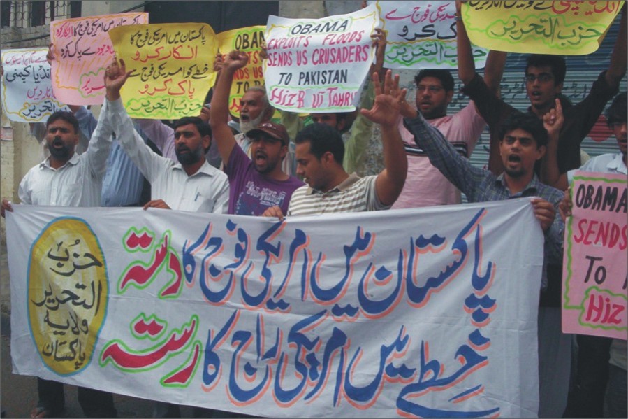 في السادس عشر من آب 2010 نظم حزب التحرير ولاية باكستان سلسلة مسيرات احتجاجية في المدن الرئيسية على قرار الإدارة الأمريكية استغلال ظرف الفيضانات وإرسال جنود المارينز إلى باكستان، تحت ذريعة مساعدة المتضررين من الفيضانات، وكانت أمريكا قد فشلت في السابق -تحت ضغط الرأي العام- من إرسال جنود لها لباكستان بحجة حماية سفارتها. طالب المتظاهرون طرد الجنود والسياسيين الأمريكان من بلاد المسلمين.