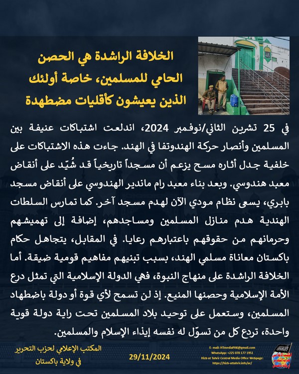 في 25 تشرين الثاني/نوفمبر 2024، اندلعت اشتباكات عنيفة بين المسلمين وأنصار حركة الهندوتفا في الهند. جاءت هذه الاشتباكات على خلفية جدل أثاره مسح يزعم أن مسجداً تاريخياً قد شُيّد على أنقاض معبد هندوسي. وبعد بناء معبد رام ماندير الهندوسي على أنقاض مسجد بابري، يسعى نظام مودي الآن لهدم مسجد آخر. كما تمارس السلطات الهندية هدم منازل المسلمين ومساجدهم، إضافة إلى تهميشهم وحرمانهم من حقوقهم باعتبارهم رعايا. في المقابل، يتجاهل حكام باكستان معاناة مسلمي الهند، بسبب تبنيهم مفاهيم قومية ضيقة. أما الخلافة الراشدة على منهاج النبوة، فهي الدولة الإسلامية التي تمثل درع الأمة الإسلامية وحصنها المنيع. إذ لن تسمح لأي قوة أو دولة باضطهاد المسلمين، وستعمل على توحيد بلاد المسلمين تحت راية دولة قوية واحدة، تردع كل من تسوّل له نفسه إيذاء الإسلام والمسلمين.