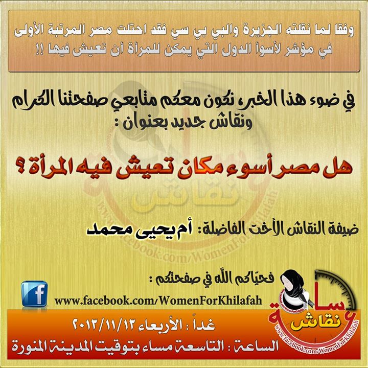في ضوء هذا الخبر، أجرى القسم النسائي في المكتب الإعلامي المركزي لحزب التحرير ساعة نقاش استضاف فيها الأخت أم يحيى وذلك يوم الأربعاء 10 محرم الحرام 1435هـ الموافق 13 تشرين الثاني/نوفمبر 2013م في تمام الساعة التاسعة مساءً بتوقيت المدينة المنورة، حيث أعلن أدمن الصفحة افتتاح باب النقاش واستقبال الأسئلة من رواد الصفحة الكرام للضيفة الفاضلة الأخت أم يحيى لبدء ساعة النقاش في الموضوع الذي تم الإعلان عنه مسبقا وهو بعنوان "هل مصر أسوأ مكان تعيش فيه المرأة؟"