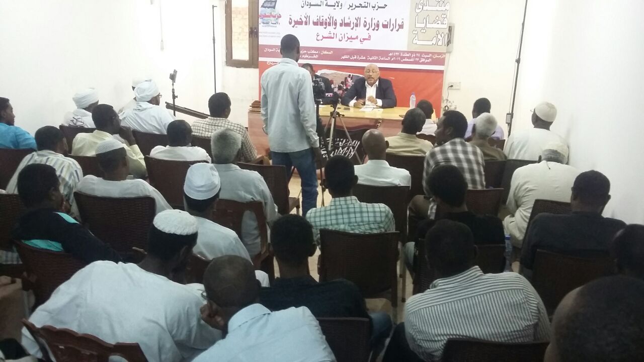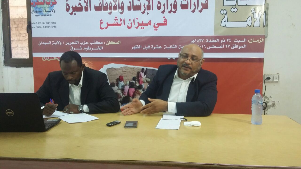 وسط أجواء مشحونة بالغضب على وزارة الإرشاد والأوقاف السودانية اكتظت قاعة المنتديات بمكتب حزب التحرير / ولاية السودان بالسياسيين والإعلاميين والمهتمين الذين لبوا دعوة الحزب لحضور منتدى قضايا الأمة الذي عقد في 2016/08/27م تحت عنوان: (قرارات وزارة الإرشاد والأوقاف الأخيرة في ميزان الشرع) قدم ورقة المنتدى الأستاذ/ ناصر رضا - رئيس لجنة الاتصالات المركزية لحزب التحرير/ ولاية السودان حيث بين للحضور الحقائق التالية: