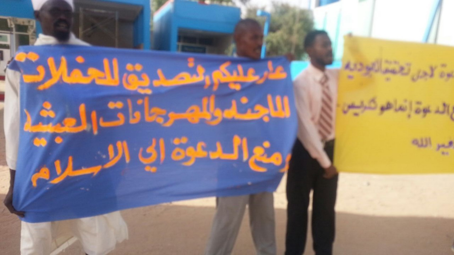وقد رفع الشباب في هذه الوقفة، شعارات تفضح الحكومة، وتكشف معاداتها للدعوة الإسلامية، وتفاهة قرارات منسوبيها، وذلك مثل: (عار عليكم التصديق للحفلات الماجنة، والمهرجانات العبثية، ومنع الدعوة إلى الإسلام)، (خير الأعمال حمل الدعوة، فعلام تمنعون إقامة معرض الكتاب الإسلامي؟!!)، (عار عليكم فتح الباب لكل ناعق وإغلاقه أمام حملة الدعوة)، (حمل الدعوة لأجل تحقيق العبودية لله، ومنع الدعوة تكريس لعبودية غير الله)... وغيرها من الشعارات.