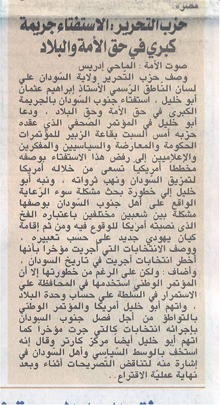 1. صحيفة صوت الأمة يوم 02/05/2010 العدد (236) الصفحة الأولى (الناطق باسم حزب الأمة القومي).