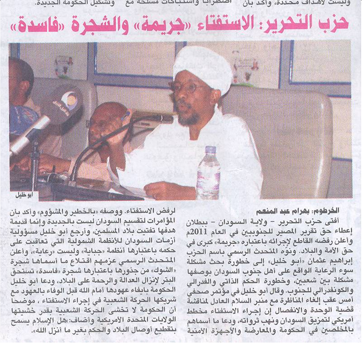 أوردت فضائيتا (الشروق والنيل الأزرق) تقارير عن المؤتمر الصحفي الذي أقامه الناطق الرسمي لحزب التحرير في ولاية السودان بمناسبة تدشين الحزب لكتيب بعنوان: (نداء من حزب التحرير- ولاية السودان.. أيها المسلمون: امنعوا قيام كيان يهود جديد في جنوب السودان)، حيث أبرزت حديث الناطق ومطالبته الغاء الاستفتاء المزمع اجراؤه لجنوب السودان في العام 2011م.