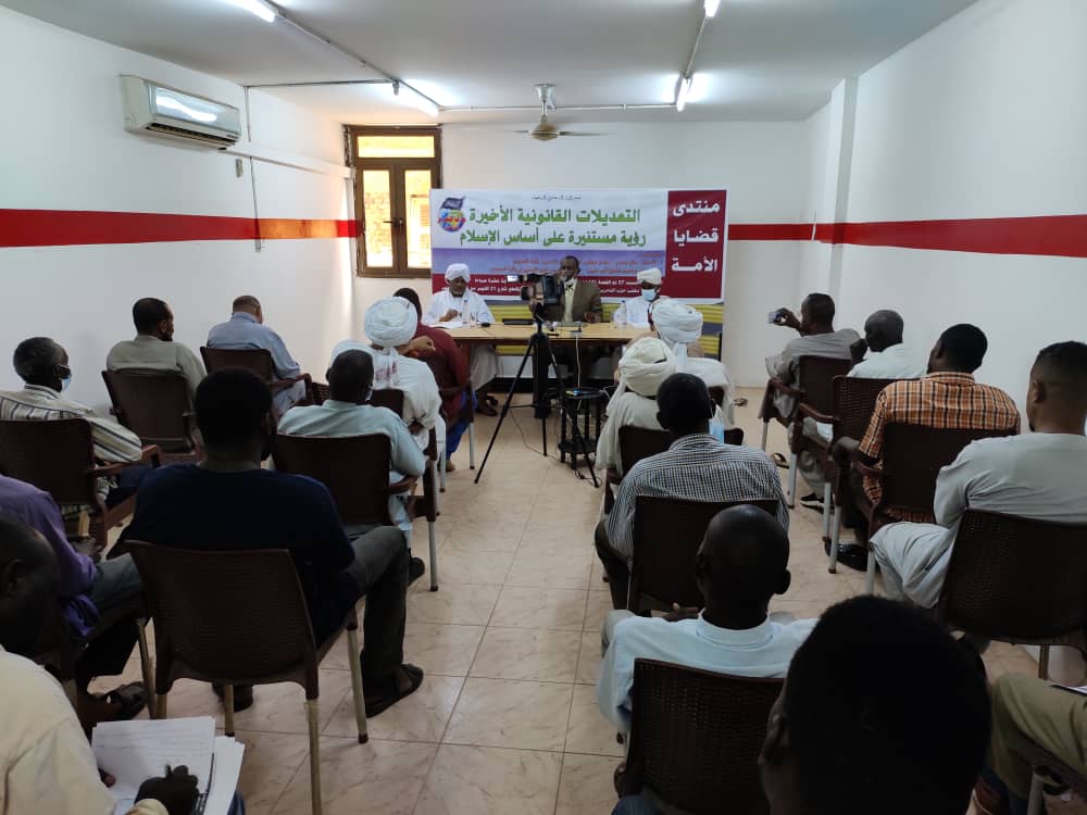 بدأ الحديث الأستاذ حاتم جعفر: الذي قدم ورقة بعنوان: (قانون التعديلات المتنوعة رؤية مستنيرة). تناول فيها إلغاء الحكومة الانتقالية لعدد من القوانين بحجة أنها مقيدة للحريات، وقال: بالاطلاع على الجريدة الرسمية العدد 1904 الصادرة يوم الاثنين 13/7/2020م، نجد أن التعديلات التي لحقت بالقوانين (35 تعديلاً على القانون الجنائي، و3 تعديلات على قانون الإجراءات الجنائية، ومادة في قانون الأحزاب، و5 مواد في قانون الأمن الوطني، ومادة في قانون المرور، و3 مواد في قانون الجوازات والهجرة، ومادتين في قانون النيابة العامة، و34 مادة في قانون مكافحة جرائم المعلوماتية، قانون جديد تحت اسم قانون مفوضية إصلاح المنظومة الحقوقية والعدلية لسنة 2020م) جملة القوانين التي وُقع عليها، والتي أثارت كثيراً من ردود الأفعال، ولكن يمكنني أن أجمل أنه حصل إلغاء لحدين شرعيين هما حد الردة المادة 126، وحد اللواط، وتم إلغاء عقوبة الإعدام والاكتفاء بالسجن، وقال إن القانون الجنائي لسنة 191 كان يعدم مرتكب اللواط، إذا تمت إدانته للمرة الثالثة. كما تم تغيير تعريف البالغ، متى يكون الشخص بالغاً مكلفا ذا أهلية قانونية؟ حيث كان تعريف البالغ حسب القانون الجنائي لسنة 191 هو: (هو الشخص الذي بلغ الحُلم بالإمارات الطبيعية القاطعة، وكان قد أكمل الخامسة عشر من عمره، ويعتبر بالغاً كل من أكمل الثامنة عشر من عمره) فتم إلغاء الجزء الأول من هذه المادة فأصبح: (البالغ هو الشخص الذي أكمل الثامنة عشر من عمره) بمعنى أن الذي تظهر عليه علامات البلوغ لا يعتبر بالغا حسب هذا التعديل مهما كان سنه، حيث تم إلغاء عقوبة الجلد في جميع القوانين، التي توصف في طريقة التشريع الغربي أنها مهينة للكرامة الإنسانية، في جميع القوانين وألغى هذه العقوبة بالكلية حتى للصبي المميز، الذي تم تغيير تعريفه من سبع سنوات إلى 12 سنة، كما تم تغيير المعيار الشرعي للدية، ونص على أن تحديد الدية بموجب القانون، كما تم إلغاء المعيار الشرعي لعقوبة السارق، التي هي القطع لمن بلغ النصاب وهو (ربع دينار)، تم إلغاؤها ليحدد ذلك بموجب القانون، كما تم تغيير تجريم شرب الخمر والتعامل بها، وتعديل تجريم ممارسة الدعارة؛ حيث حذف النص الذي يُعرِّف الدعارة أنها وجود رجال ونساء في مكان ما بصورة غير شرعية ما نصه: (يقصد بمحل الدعارة أي مكان معد لاجتماع رجال أو نساء أو رجال ونساء لا تقوم بينهم علاقات زوجية، أو صلات قربى وفي ظروف يرجح فيها حدوث ممارسة جنسية)، قاموا بحذف هذه المادة وتقييد الدعارة بثلاث نقاط؛ يقصد بمكان الدعارة أي محل معد لممارسة الدعارة، أو سبقت إدانة لحائزيه، أو إذا تكررت شكوى منه للجهات المختصة، مما يعني أن الدعارة لا تعتبر جريمة إذا مورست في أماكن خاصة بالأشخاص مثل مكتب أو بيت ولم تنطبق عليهم النقاط الثلاث، فلا يعتبر دعارة، فربطوا الدعارة بثلاث نقاط وسواها لا يكون دعارة، وهذا بوضوح تحليل اجتماع الرجال والنساء بغير غرض مشروع، كما يعتبر الزنا جريمة، مع إلغاء عقوبة الجلد.