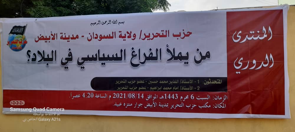 كما أقام شباب حزب التحرير/ ولاية السودان بمدينة الأبيض المنتدى الدوري يوم 14 آب/أغسطس 2021م والذي جاء بعنوان: "من يملأ الفراغ السياسي في البلاد؟" تحدث فيه الأستاذ إمام محمد إبراهيم مقدماً الورقة الأولى بعنوان: "الفراغ السياسي" مبيناً معنى الفراغ بأنه عدم القدرة على العمل والثبات، معدداً أنواع الفراغ العسكري والاستراتيجي والسياسي مع ذكر الأمثلة لكل منها، كما تحدث الأستاذ النذير محمد حسين في ورقته عن "كيف وجد هذا الفراغ وكيف يُملأ؟" موضحاً أن الفراغ أوجدته الدول الاستعمارية عقب الثورة الصناعية في أوروبا واحتياجها لسوق لتسويق منتجاتها الصناعية، ففكرت في القضاء على دولة الخلافة العثمانية وذلك ببث أفكار القومية والوطنية وَالحرية والديمقراطية، هذه الأفكار أوجدت عدم انسجام مع معتقدات ومفاهيم الأمة أدت إلى هذا الفراغ السياسي. ثم جاء الاستعمار من أجل ملء هذا الفراغ فلم ينجح في ذلك، فلجأ إلى صناعة العملاء، ولا يمكن ملء هذا الفراغ إلا بعقيدة روحية تنبثق عنها معالجات لجميع مشاكل الإنسان، وهذا لا يتأتى إلا بعقيدة الإسلام العظيم وأنظمته؛ وذلك لا يكون إلا بإقامة سلطان الإسلام؛ وهو نظام الخلافة، فكان حزب التحرير الذي يصل ليله بنهاره من أجل تحقيق ذلك بينما فشلت كل التيارات والأحزاب والحركات المسلحة وغيرها من ملء هذا الفراغ عسكرياً أو مدنياً، فهلم للعمل مع حزب التحرير لأنه يمتلك برنامجاً متكاملاً مبنياً على عقيدة الأمة.
