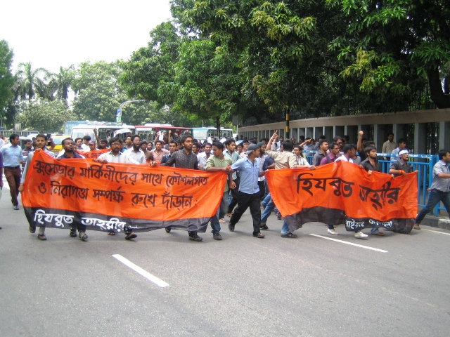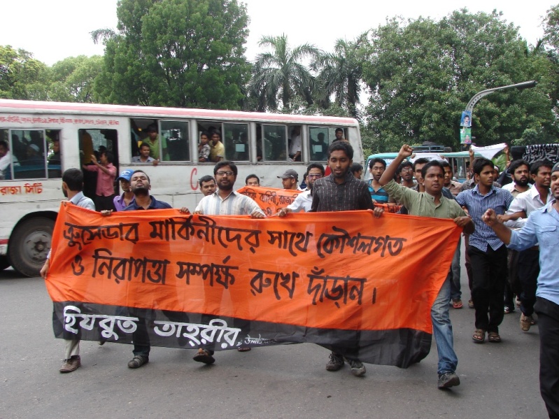 الأميركيون يتقدمون بسرعة نحو تحقيق هدفهم بمساعدة الخائنة حسينة والنظام الديمقراطي القائم، فهل تسمحون لهذه العملية بالاستمرار؟ وهل تقبلون أن تصبحوا عبيدا لأميركا مثل حكامكم؟ كلا! يجب أن لا نسمح لذلك أبدا، فاحتجوا على زيارة هيلاري، وارفضوا العلاقة الإستراتيجية والأمنية مع أمريكا الصليبية، ومن دون أي تأخير، انضموا إلى الكفاح من أجل إزالة هذه الإمبريالية، النظام الديمقراطي الذي يقوم على الخطف والقتل... وإعادة إقامة دولة الخلافة التي ستحمي سيادة البلاد وأمنها وتبني جيشا قويا، وتبني اقتصادا قائما على الصناعة الثقيلة، بعد القضاء على الإمبريالية التي تهيمن على اقتصاد البلاد وعلى الحكم والجيش.