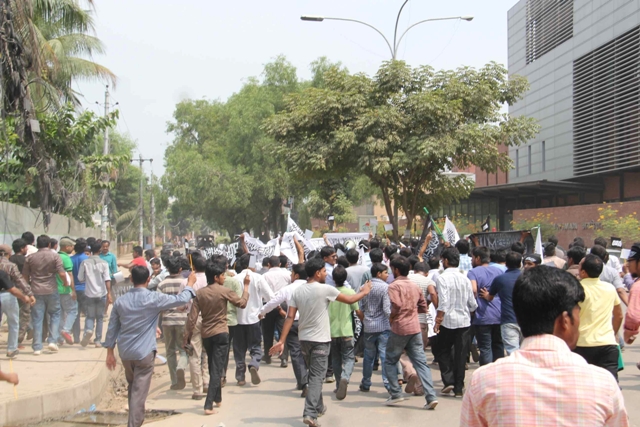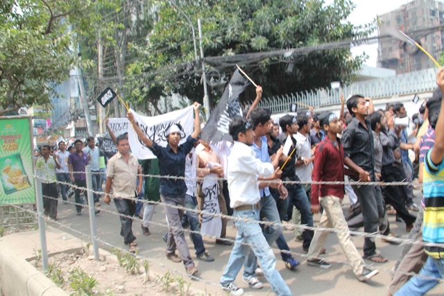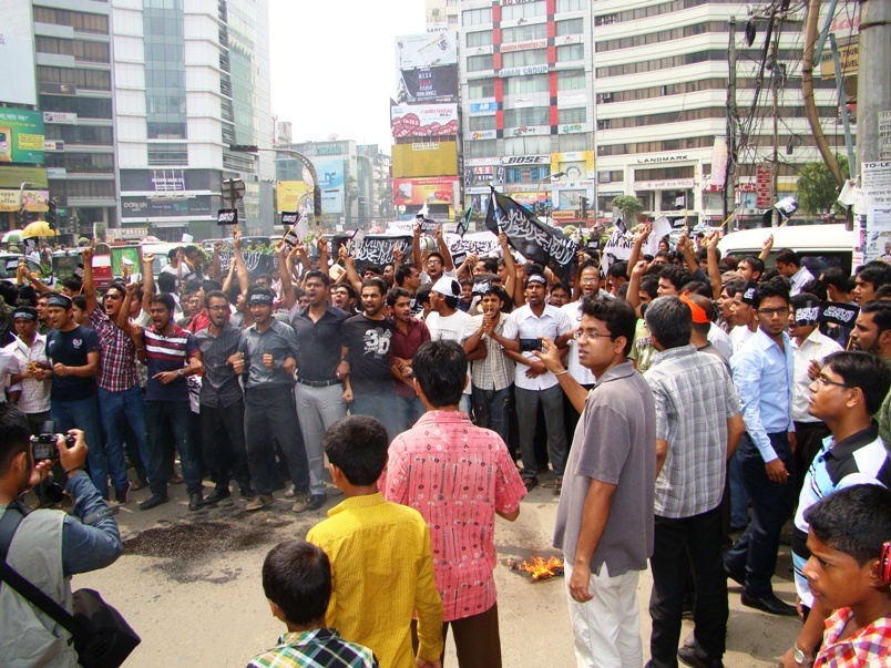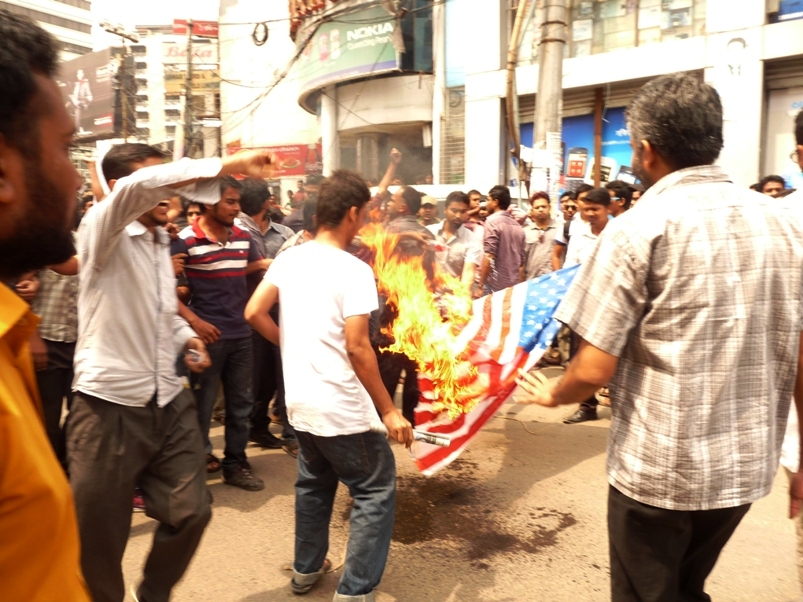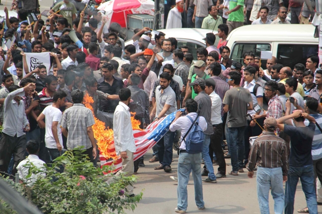 سار نحو 500 مسلم تحت قيادة حزب التحرير اليوم الاثنين، 24/9/2012، نحو السفارة الأمريكية في دكا للاحتجاج على الفيلم المثير للاشمئزاز الذي أنتجه الأوغاد الأمريكيون، الذي أهانوا فيه النبي محمد صلى الله عليه وسلم، وقد بدأت المسيرة من الدائرة الثانية في العاصمة، حيث أحرق المسلمون العلم الأمريكي ورفعوا راية العقاب واللواء عاليا، وفي مشهد يعكس حب المشاركين للنبي عليه الصلاة والسلام تقدم المتظاهرون نحو الشارع الذي تقع فيه السفارة الأمريكية وهم يرددون "الله أكبر، الله أكبر، لا إله الله محمد رسول الله" و"الموت لأمريكا" و"لا للوجود الأمريكي في بنغلادش"... وغيرها، وعلى النقيض من ذلك، فقد أظهرت حكومة حسينة الحرص على مبنى سفارة أسيادها، حيث أمرت الشرطة بالهجوم على المسلمين عندما وصلوا إلى البوابة الأمامية للسفارة، وألقت القبض على شخص واحد.