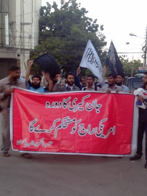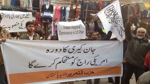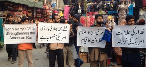 نظّم حزب التحرير / ولاية باكستان مظاهرات في جميع أنحاء باكستان ضد زيارة وزير خارجية الولايات المتحدة (جون كيري)، وقد رفع المشاركون فيها لافتات كُتب عليها: "زيارة جون كيري: تعزيز للهيمنة الأمريكية" و"اقضوا على الهيمنة الأمريكية بإقامة الخلافة". وقد أكّد المحتجون على أن زيارة جون كيري لباكستان لما يسمى بالحوار الاستراتيجي ستعزّز الهيمنة الأمريكية في باكستان.