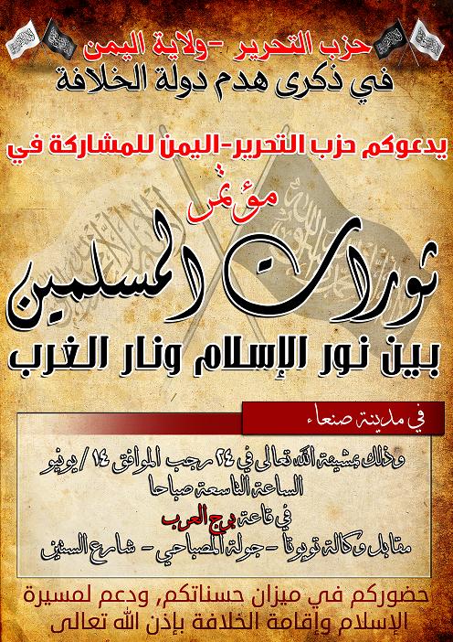 يدعوكم حزب التحرير ولاية اليمن لحضور مؤتمره السنوي الذي يعقد إحياء للذكرى الأليمة، ذكرى هدم دولة الخلافة الإسلامية والتي تصادف في عامنا الحالي الذكرى الحادية والتسعين،