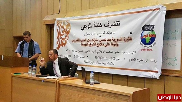 استضافت كتلة الوعي، الإطار الطلابي لحزب التحرير، أمس الثلاثاء الموافق 30/8/2016، عضو المكتب الإعلامي لحزب التحرير في فلسطين المهندس باهر صالح، ليحاضر في ندوة بعنوان "الثورة السورية بعد خمس سنوات من الحرب الضروس وأثرها على ملامح الشرق الأوسط".ركّز صالح في بداية محاضرته على بيان حقيقة ما يجري في سوريا ولأهلها، واصفًا الحرب على الثورة السورية وأهلها بالضروس، مستشهدا على ذلك بما تمّ استخدامه من الأسلحة الفتاكة "المحرمة دوليا"، من كيماوية ونابالم وكلور وخردل وبراميل متفجرة وقاذفات، معظمها سقط فوق رؤوس المدنيين من الأطفال والنساء والشيوخ.ومن جهة أخرى سلط الضوء على المشاركين والفاعلين في الحرب ضدّ الثورة خلال الخمس سنوات السابقة، من دول كبرى مثل أمريكا وروسيا وبريطانيا وفرنسا، ودول إقليمية مثل إيران والسعودية وقطر والأردن وتركيا مؤخرا، وحزب إيران، وتحالف دولي بقيادة أمريكا الذي يضم أكثر من عشرين دولة، وتحالف إسلامي بقيادة السعودية الذي يضم أربعين دولة، منوهًا إلى وصف بعض المراكز الإعلامية لما يحدث في سوريا بالحرب العالمية.وأشار صالح في محاضرته إلى المؤتمرات واللقاءات وحجم الخطط والمشاريع، والى كثرة الجولات والزيارات من قبل قادة الدول ووزرائهم إلى المنطقة، بالإضافة إلى المبعوثين الأمميين الذين كان آخرهم ديميستورا، ومذكّرا بما صرّح به أوباما قبل أسبوعين من أن معظم الشيب الذي في رأسه كان بسبب الاجتماعات التي عقدها بشأن سوريا.وقد تساءل صالح عن الخطر الذي يراه الغرب وعملاؤه وأشياعه قادمًا من الشام، وعن حجم ذلك الخطر الذي يستدعي استنفار كل إمكانياتهم العسكرية والسياسية والمخابراتية والإعلامية، ويستدعي التضحية بسمعتهم ومكانتهم أمام الرأي العام،