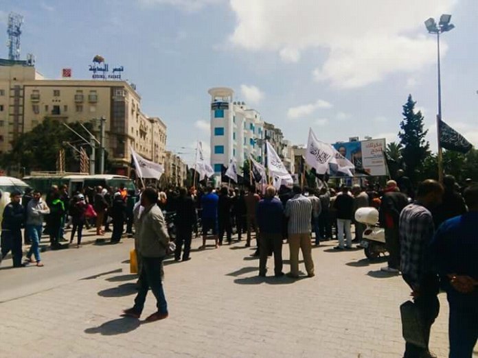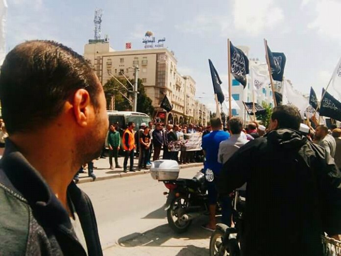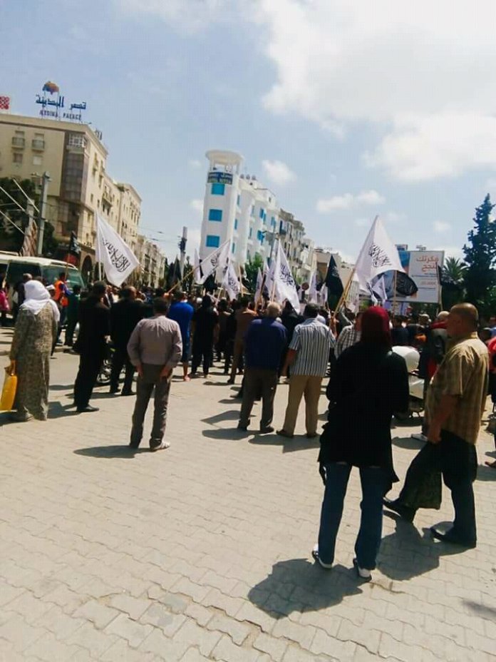وتجمع عشرات ﻣﻦ ﺃﻧﺼﺎﺭ ﺣﺰﺏ ﺍﻟﺘﺤﺮﻳﺮ في مظاهرة ﺭﺍﻓﻌﻴﻦ ﺷﻌﺎﺭﺍﺕ ﺗﻄﺎﻟﺐ ﺑﺘﺤﺮﻳﺮ ﻓﻠﺴﻄﻴﻦ " يا جيوش المؤمنين نحبو نحرروا فلسطين"، وﻫﺘﻒ ﺍﻟﻤﺤﺘﺠﻮﻥ ﻣﻄﺎﻟﺒﻴﻦ ﺍﻳﻀﺎ ﺑﺈﻗﺎﻣﺔ ﺩﻭﻟﺔ ﺍﻟﺨﻼﻓﺔ ﺍﻻﺳﻼﻣﻴﺔ.