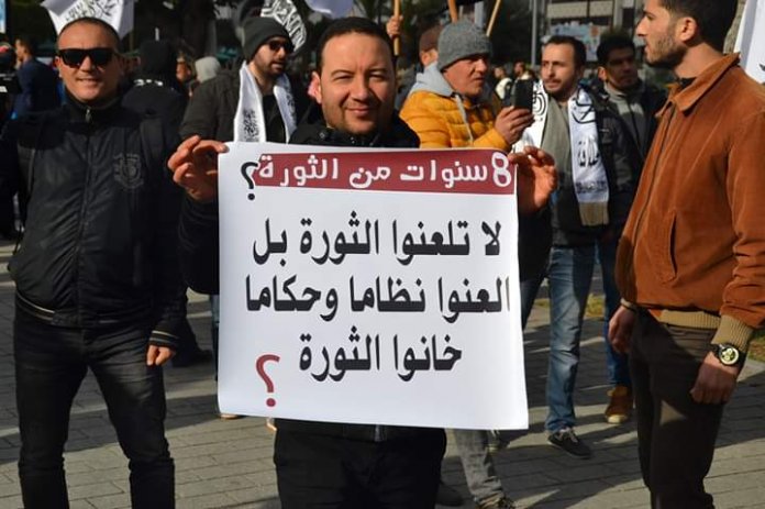 تجمّع اليوم الاثنين 14 جانفي أنصار حزب التحرير بشارع الحبيب بورقيبة بالعاصمة في الذكرى الثامنة للثورة.