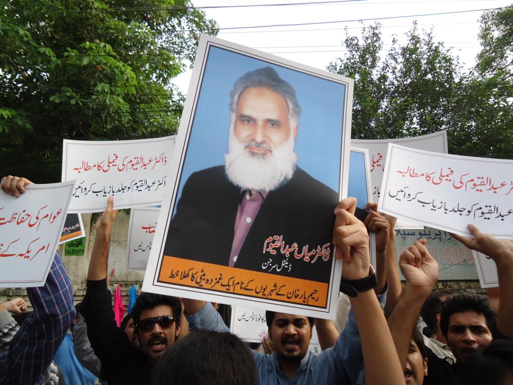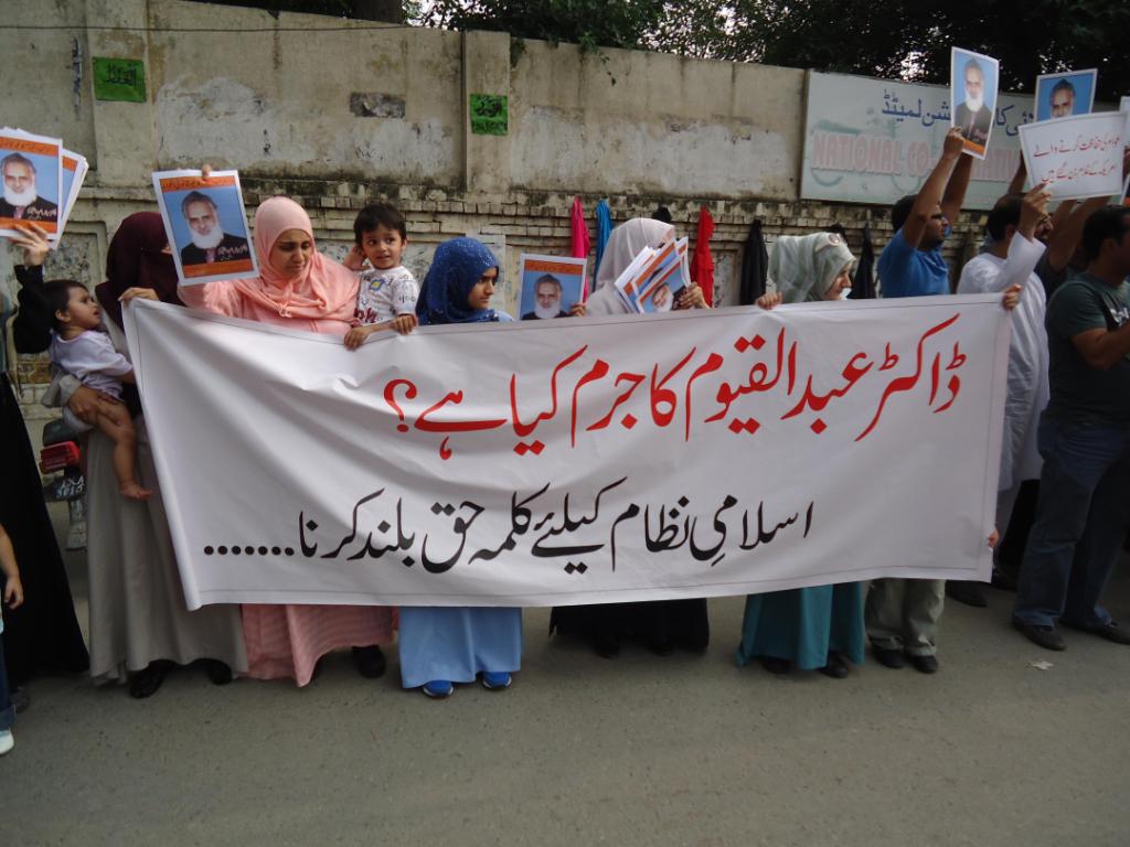 نظّمت عائلة الدكتور عبد القيوم، عضو حزب التحرير المختطف من قبل الأجهزة الأمنية السرية التابعة لقيادة الجيش والحكومة الخائنتين، نظمت العائلة والمؤيدين للدكتور عبد القيوم تظاهرة أمام النادي الصحفي في مدينة لاهور في 26 من آب 2011، وقد رفعوا يافطة كتب عليها (( ما هي جريمة الدكتور عبد القيوم؟ قول كلمة الحق للحكم بالإسلام)).