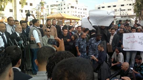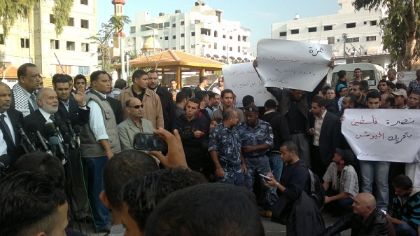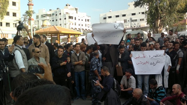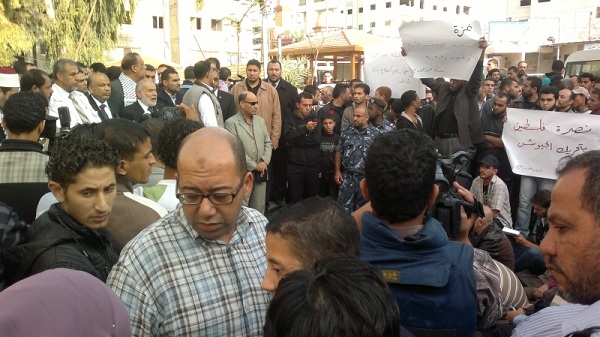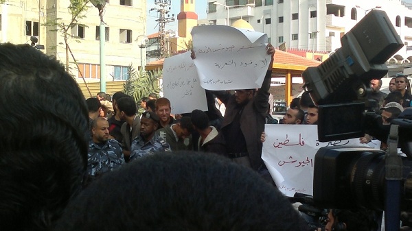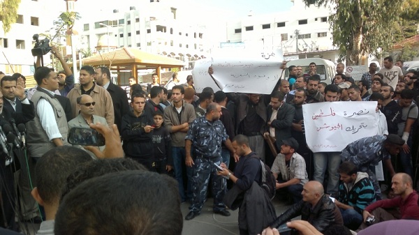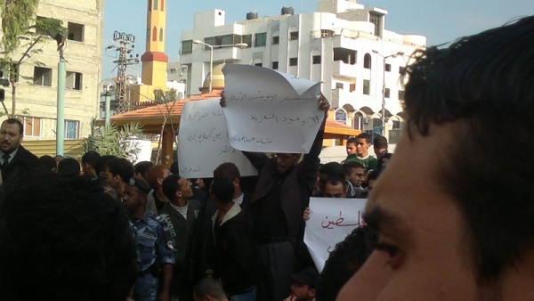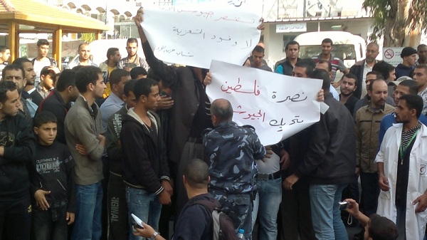 أمام تجمع عدد من القوى والشخصيات المصرية القادمة للتضامن مع قطاع غزة التي يقتل أهلها ليل نهار وليس آخرها جريمة قتل عائلتي الدلو وعزام، قام يوم الاثنين 05 محرم الحرام 1434هـ الموافق 19 تشرين الثاني/نوفمبر 2012م عدد من شباب حزب التحرير في مستشفى الشفاء بمدينة غزة برفع يافطات كتب عليها "غزة تستنصر جيوش الأمة لا وفود التعزية"، "نصرة فلسطين بتحريك الجيوش" حيث ضم هذا التجمع خطيب الثورة المصرية، ورئيس حزب العدالة والتنمية المصري سعد الكتاتني، إضافة إلى نبيل شعث كممثل عن سلطة عباس وغيرهم.