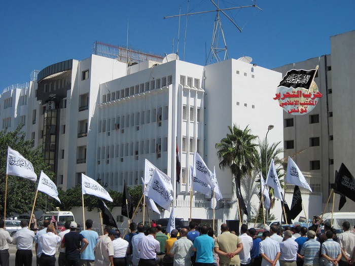 نظم حزب التحرير / تونس وقفة احتجاجية أمام السفارة المصرية بتونس يوم الخميس 08 شوال 1434هـ الموافق 15/08/2013م على اثر الفض الدموي لاعتصام رابعة العدوية وميدان النهضة الذي أدى إلى مقتل المئات أو الآلاف من المسلمين بغير حق، الشيء الذي يغضب رب العباد ولا يقبله إنسان.