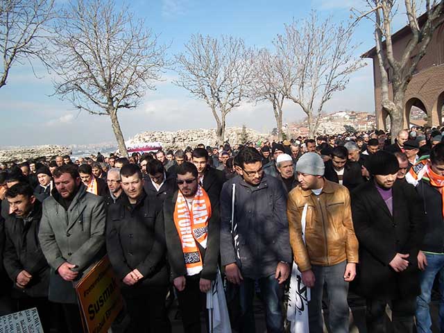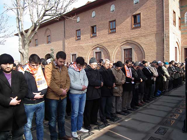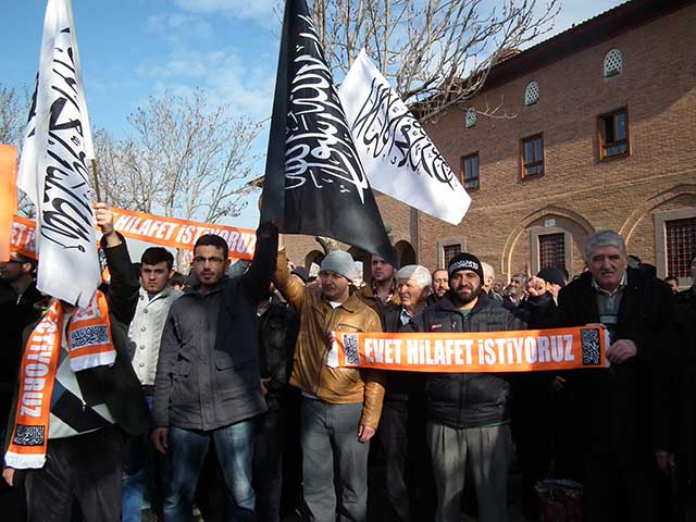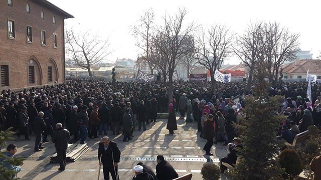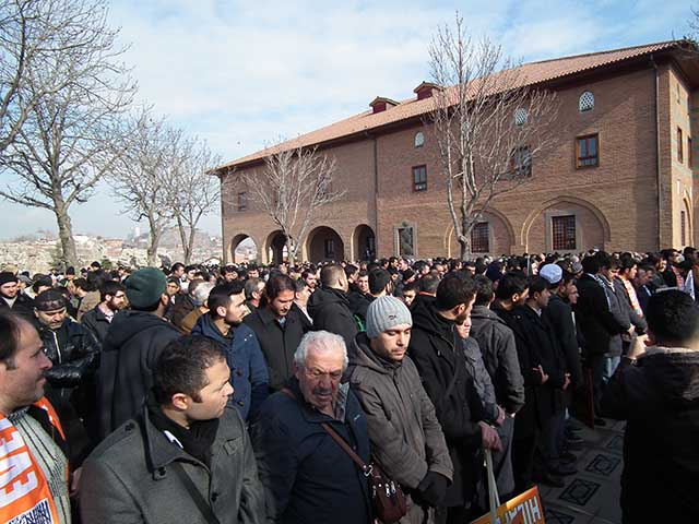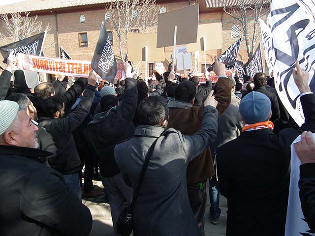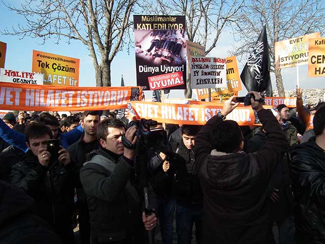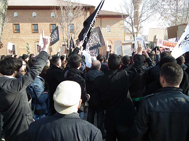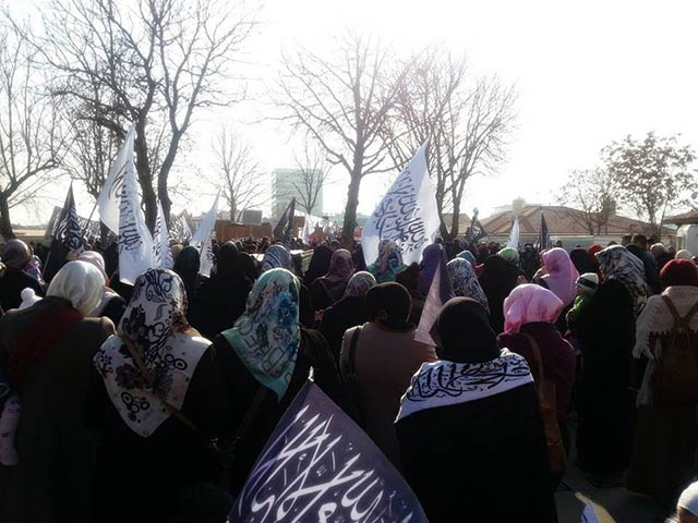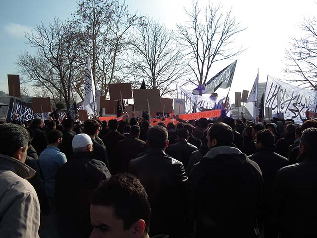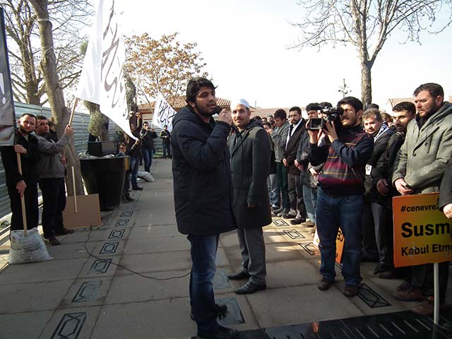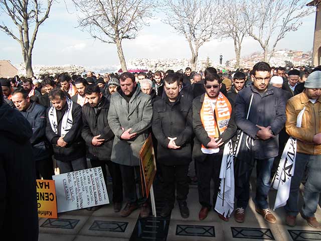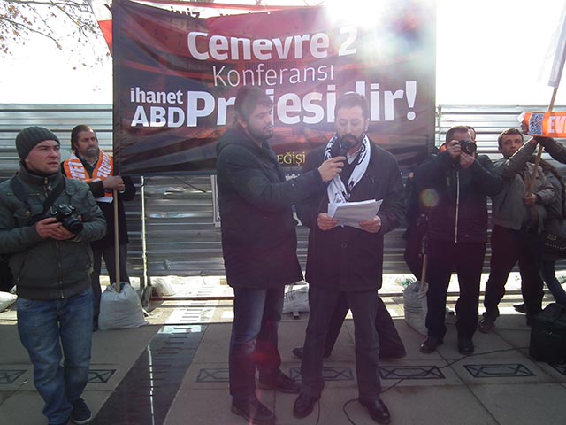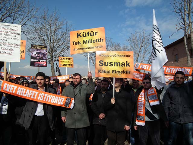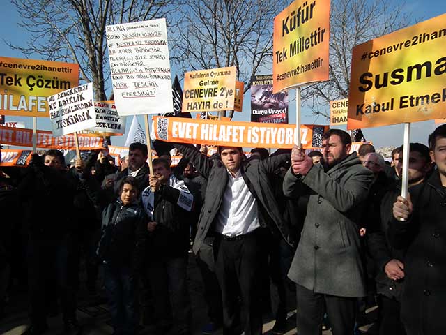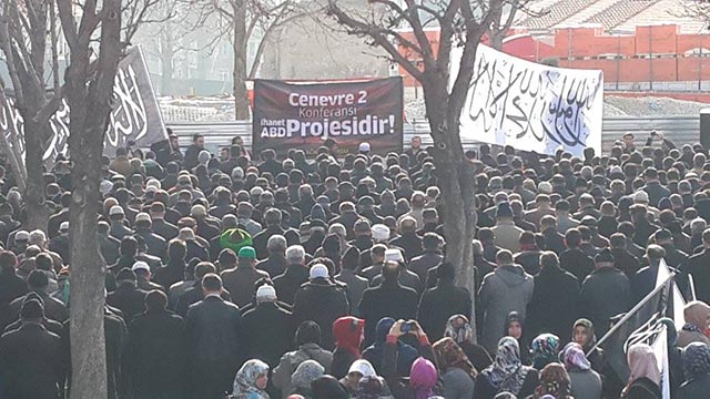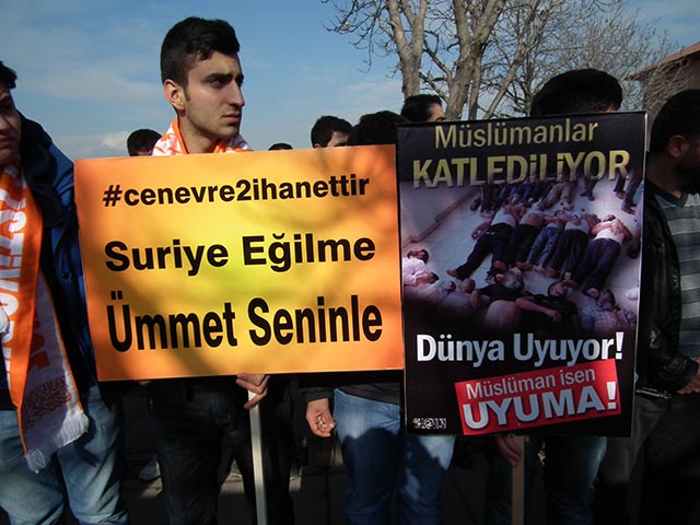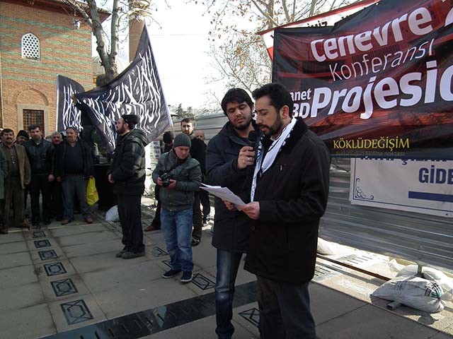 ولاية تركيا: وقفة في أنقرة لرفض مؤتمر جنيف-2 نظم شباب وأنصار حزب التحرير / ولاية تركيا في جامع حجي بيرام بأنقرة وقفة قرأ فيها بيان صحفي للتأكيد على أن مؤتمر جنيف-2 هو مؤتمر تآمري خياني، وأقيمت صلاة الغائب على المسلمين الذين قتلوا في المجازر الوحشية الت