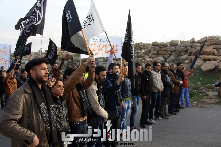 وفيما رفع المتظاهرون أعلام (الخلافة) والشعارات الحزبية، هتفوا بسقوط الحكومة السورية والإئتلاف السوري المعارض مطالبين بإقامة الدولة الإسلامية.
