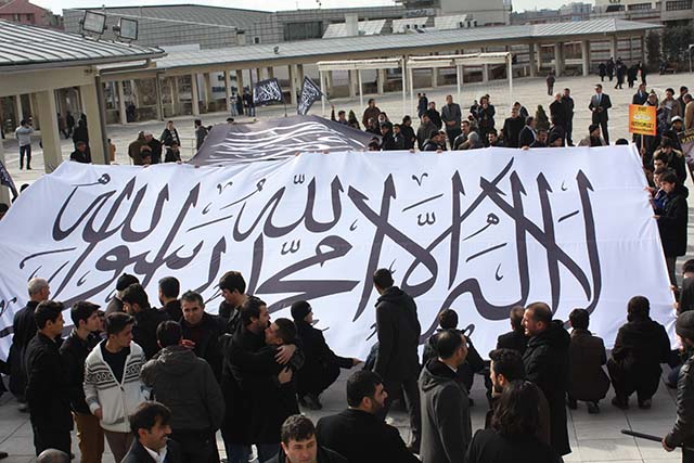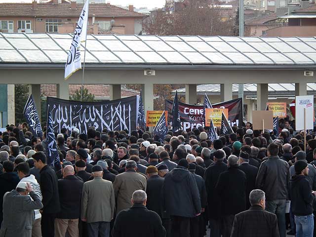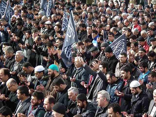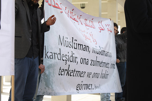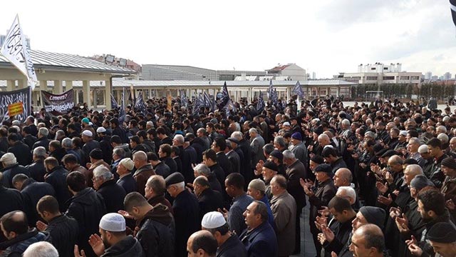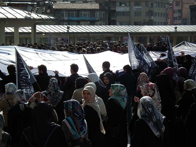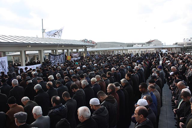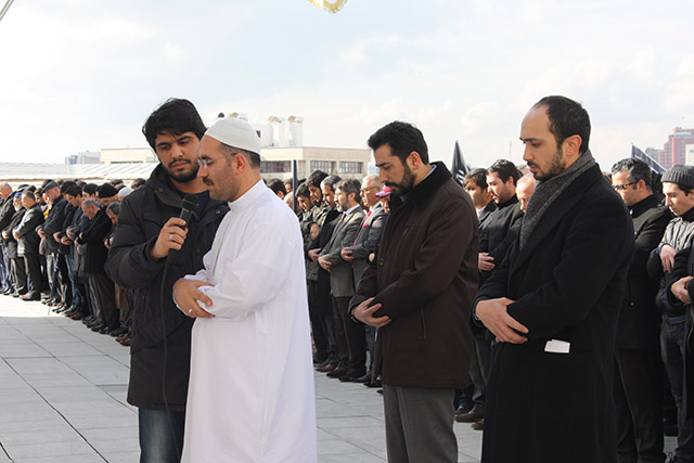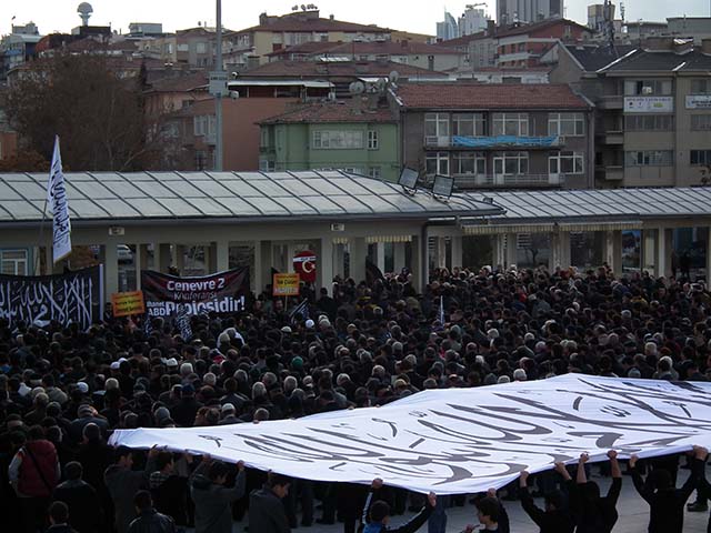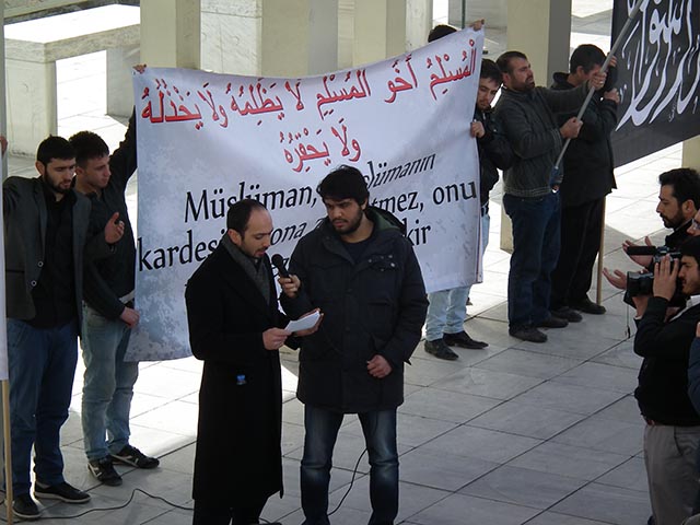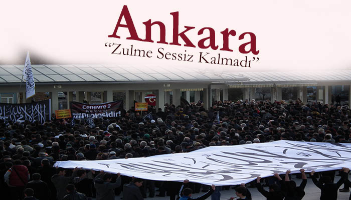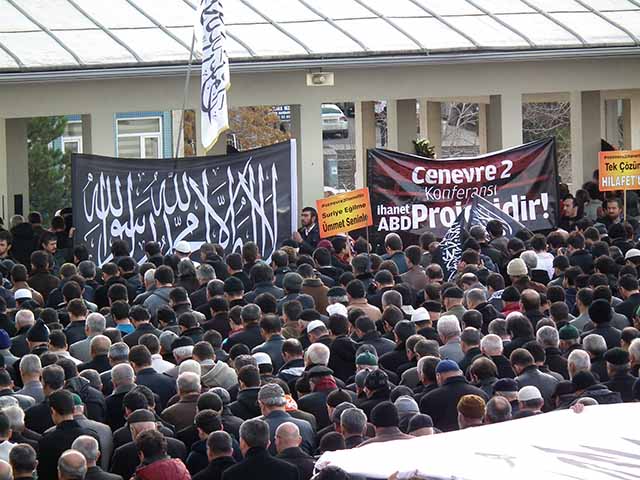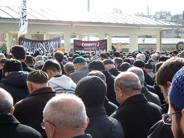 ولاية تركيا: وقفة أنقرة لرفض مؤتمر جنيف2 الخياني نظم حزب التحرير / ولاية تركيا وأنصاره في جامع كوجاتابه بأنقرة وقفة بعنوان "أنقرة لم تسكت على الظلم!" للتنديد ورفض وكشف زيف مؤتمر جنيف2 التآمري الخياني، أقيمت فيها صلاة الغائب على قتلى المسلمين في أرض الشام