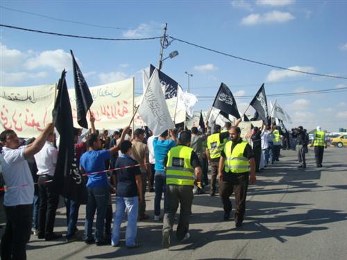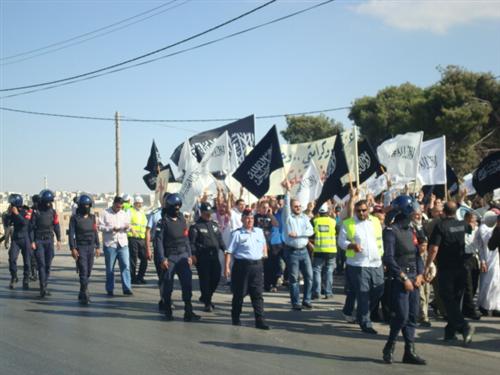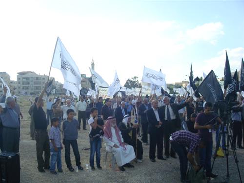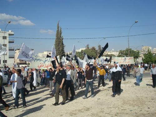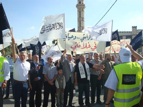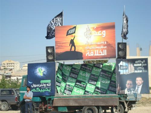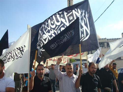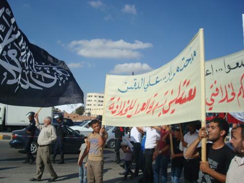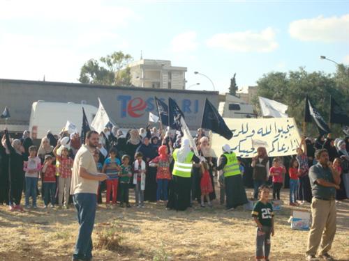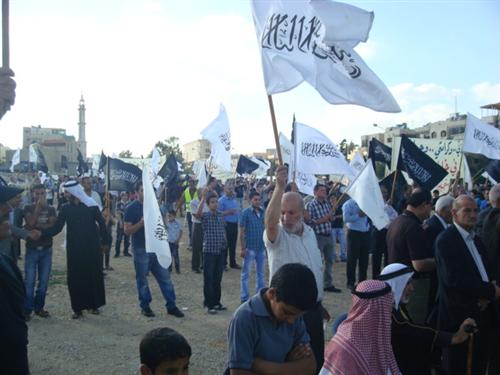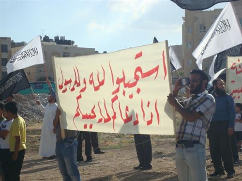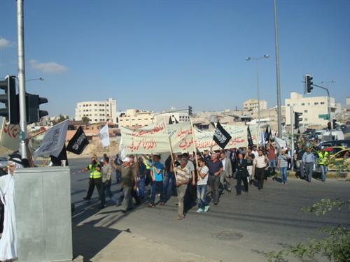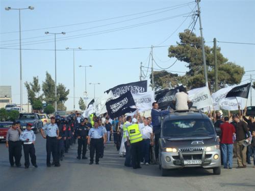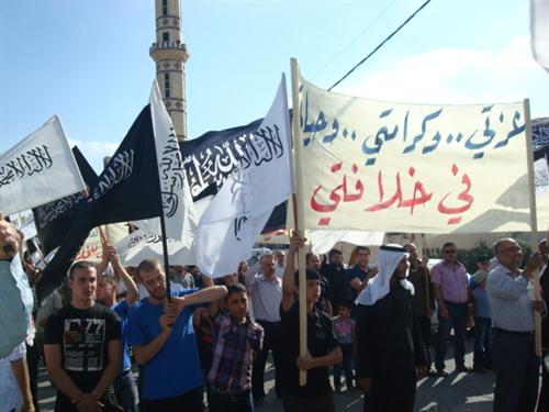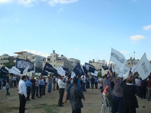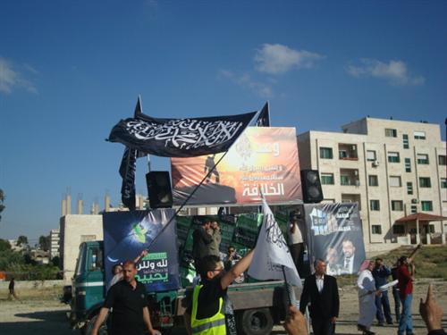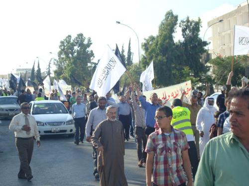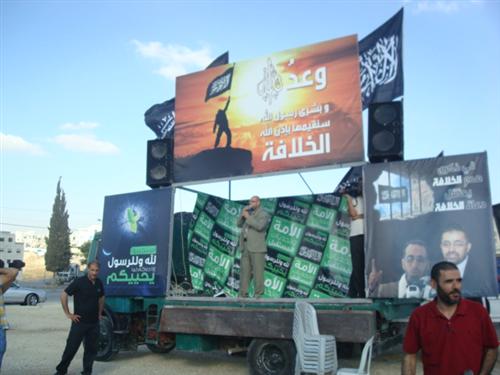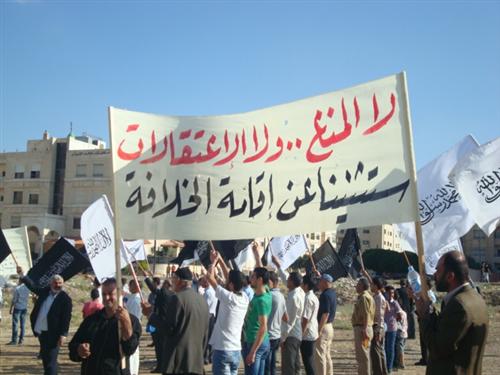وتوجهت مسيرتان باتجاه الساحة المقابلة لمستشفى الحياة من مسجد أبو أيوب الأنصاري ومسجد أبو زمع، وسط تواجد أمني كثيف، فيما رفعت الرايات السوداء والبيضاء المكتوب عليها (لا إله إلا الله محمد رسول الله)، بالإضافة إلى لافتات تطالب بإقامة الخلافة، وأخرى منددة بأعتقال أعضاء من الحزب.