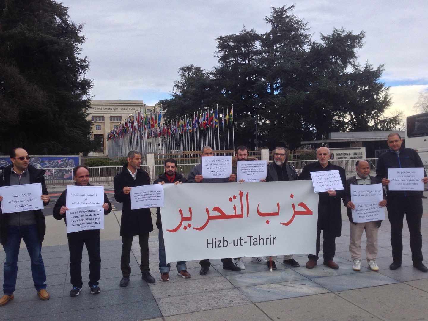 قام شباب حزب التحرير في سويسرا يوم السبت 05 جمادى الآخرة 1438هـ الموافق 04 آذار/مارس 2017م بتنظيم وقفةٍ أمام مبنى الأمم المتحدة في جنيف احتجاجاً على عقد جولةٍ جديدةٍ من المفاوضات بين ما يسمى بالمعارضة السورية وبين شبيحة النظام السوري المجرم، وقد تضمنت الوقفة رفع لافتةٍ كبيرةٍ كتب عليها حزب التحرير باللغة العربية والإنجليزية للتعريف بأن من نظم هذه الوقفة هم شباب حزب التحرير، وأما الشعارات التي رفعها الشباب فقد كانت باللغة العربية مع ترجمتها إلى اللغة الفرنسية، وكانت الشعارات كما يلي:
