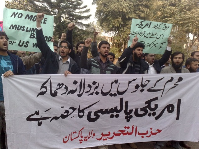 في ضوء الهجوم الجبان الذي شن على موكب ذكرى العاشر من محرم في كراتشي، والذي راح ضحيته أكثر من 40 شهيدا من المسلمين والعديد من الجرحى، نظم حزب التحرير في ولاية باكستان سلسلة مظاهرات في المدن الرئيسة الباكستانية، كما أرسل وفود من أعضاء الحزب إلى الحسينيات في البلاد لتقديم التعازي واستنكار الهجوم الجبان. استنكر حزب التحرير بشدة العمليات التفجيرية البشعة التي تقوم بها أمريكا، مستخدمة شركات القتل التابعة لها من مثل شركة ( Xe للخدمات) والتي كانت تعرف بشركة Blackwater . كما أدان حزب التحرير الممارسات الأمريكية الجبانة في العراق وأفغانستان، ودعا إلى العمل الفوري لإقامة دولة الخلافة، التي ستعمل على توحيد الأمة الإسلامية وتنهي جميع أشكال الاستعمار من العالم الإسلامي. في أثناء المظاهرة التي نظمت في مدينة لاهور تعرض المتظاهرين لاعتداء الأجهزة الأمنية وتم اعتقال بعضهم.