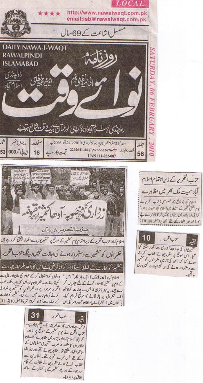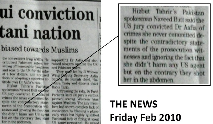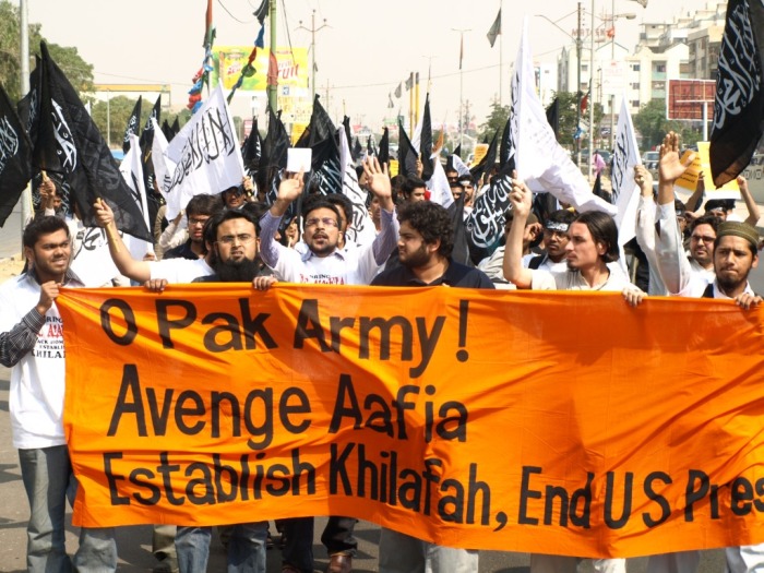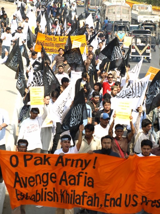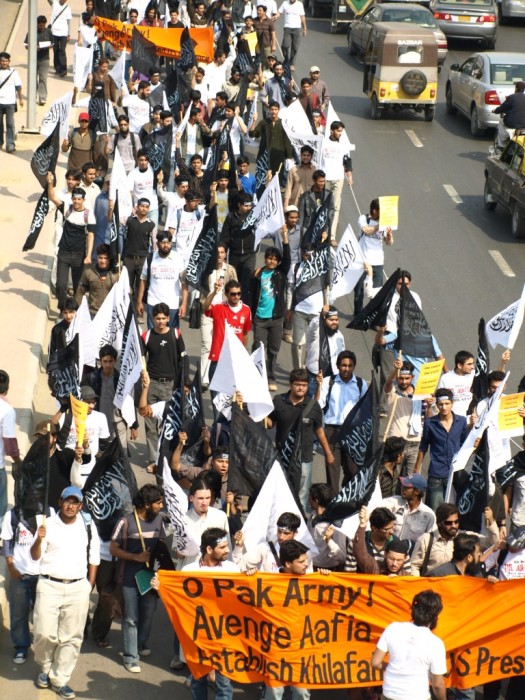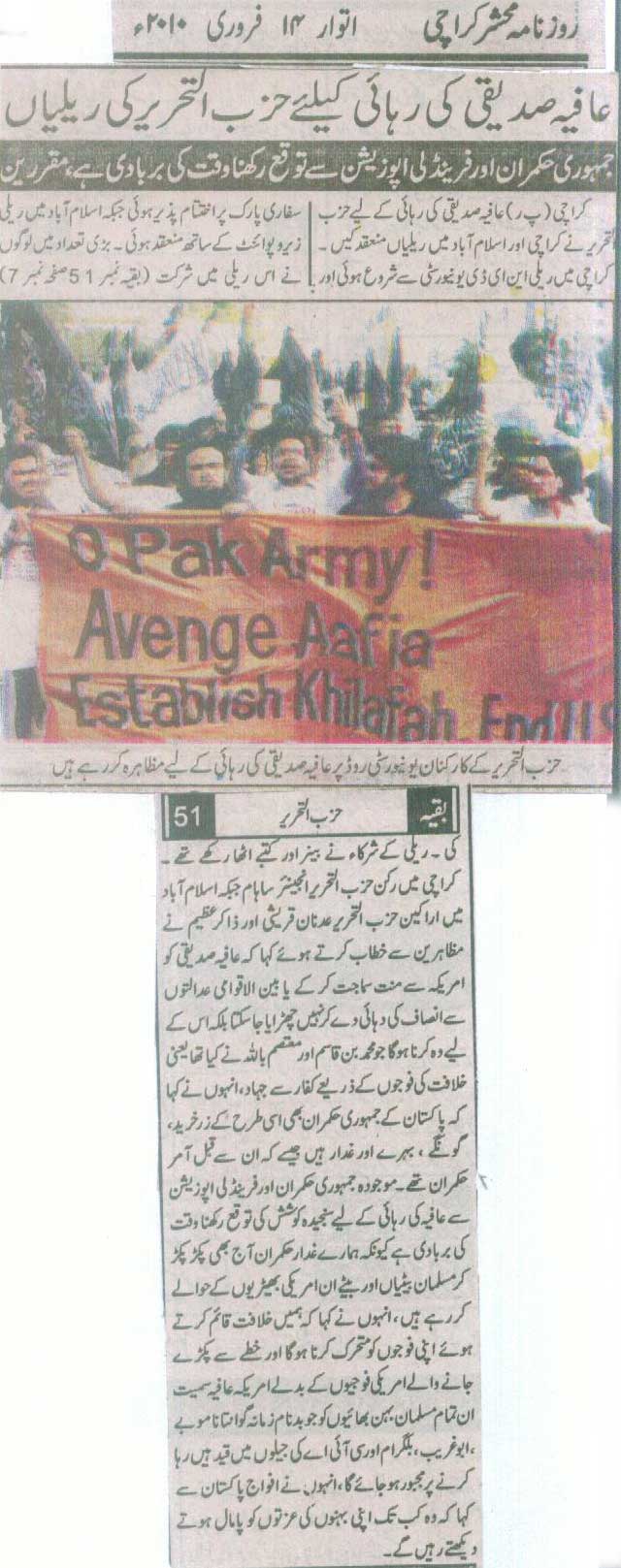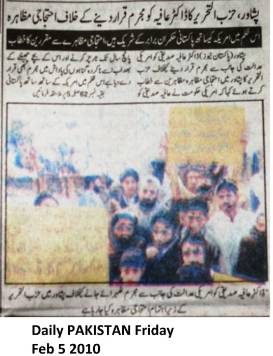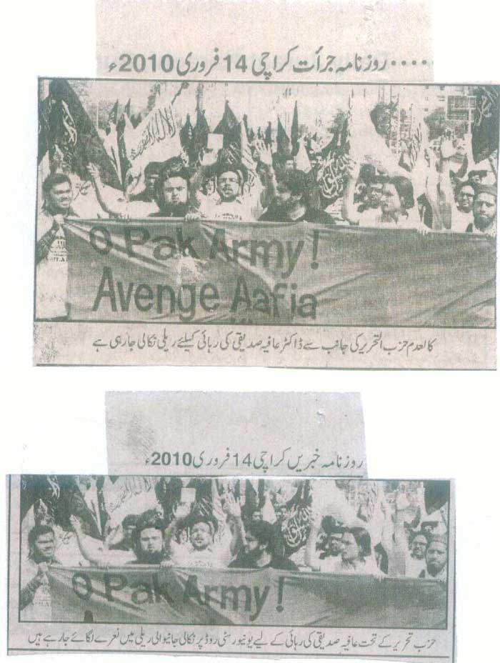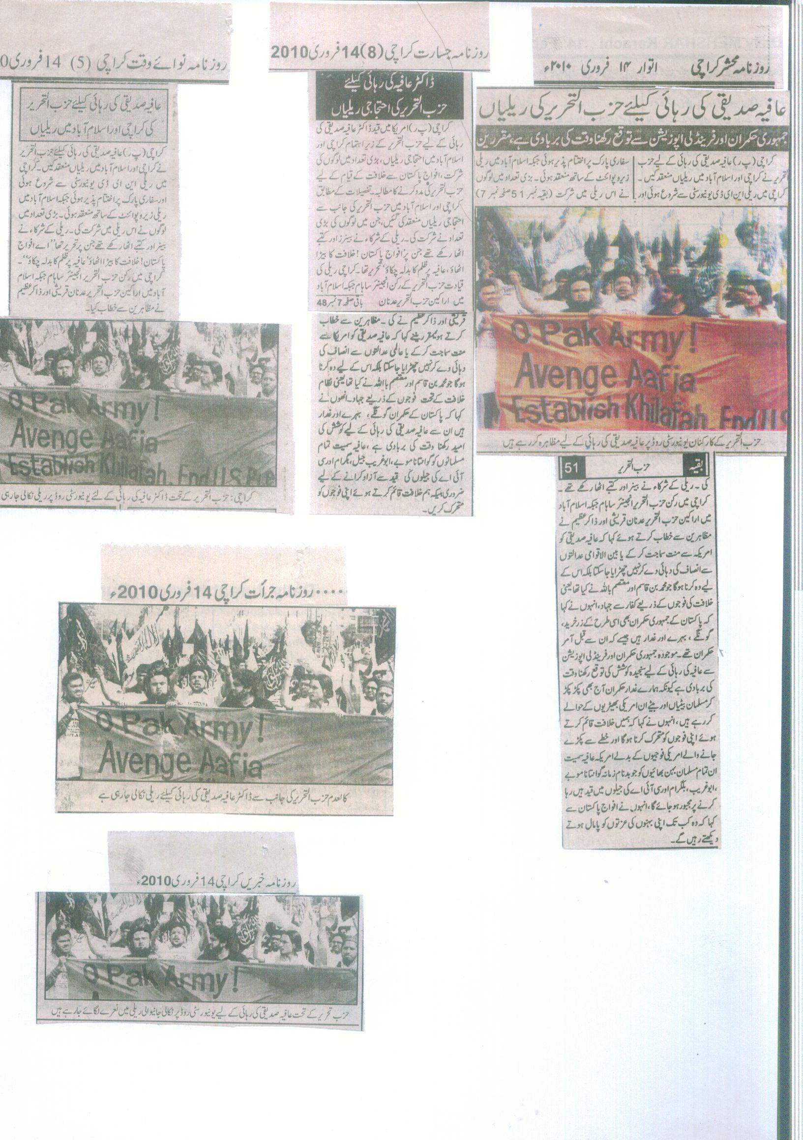 سير حزب التحرير في 21 من صـفر 1431الموافق 2010/02/04م مظاهرات في إسلام أباد وكراتشي ولاهور وبيشاور للاحتجاج على بشاعة الحكم الجائر بحقها. حمل المتظاهرون يافطات كُتب عليها شعارات من مثل " أيها الجيش الباكستاني اثأر لعافية وأقم الخلافة، واقض على الوجود الأمريكي". كما طالب المتظاهرون الجيش الباكستاني بإعطاء النصرة لحزب التحرير لإقامة دولة الخلافة، كي تنظم الجهاد وتبدأ بالذود عن حرمات المسلمين.