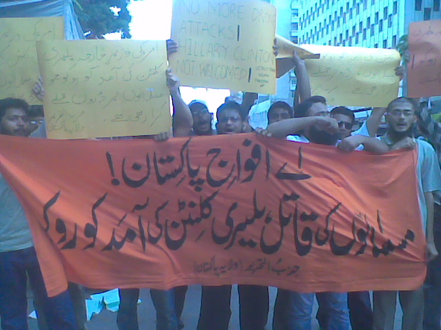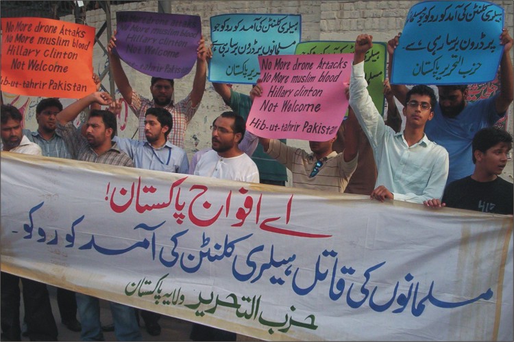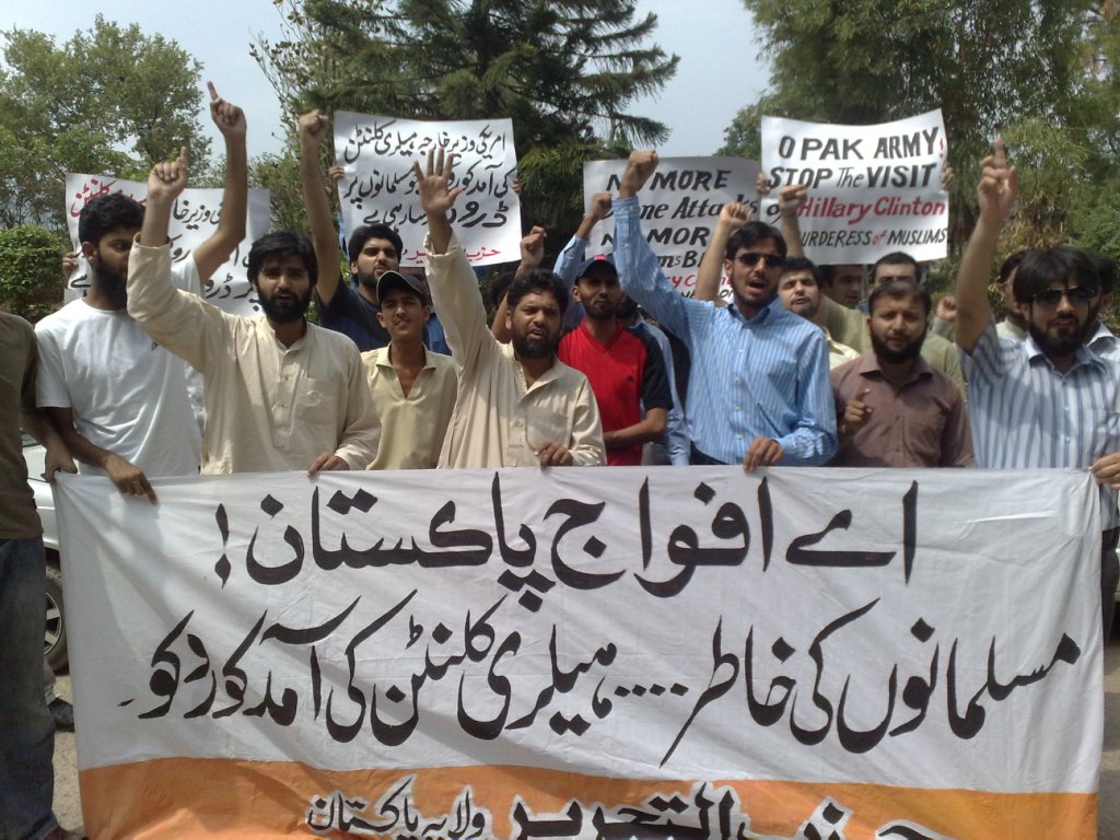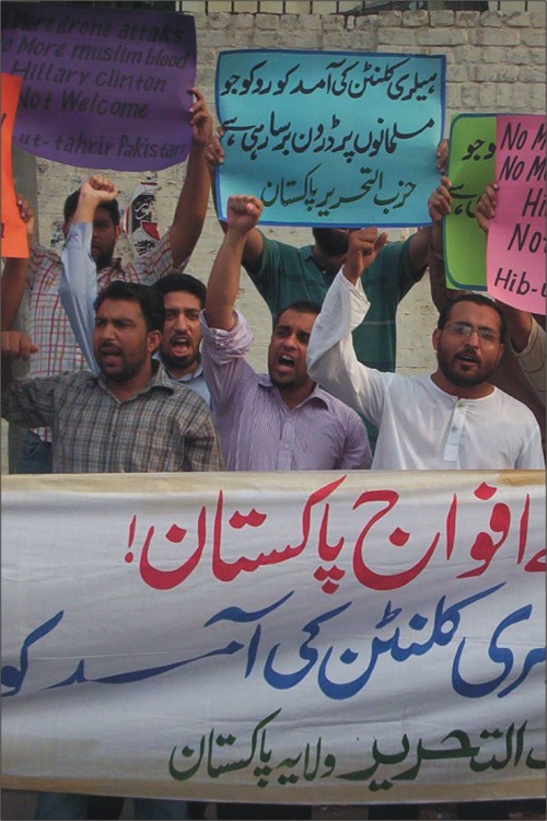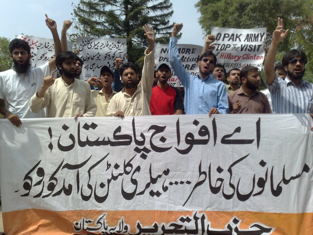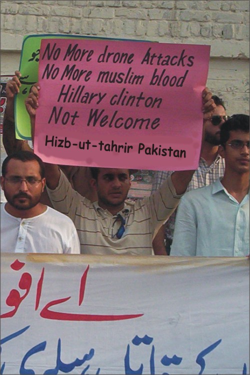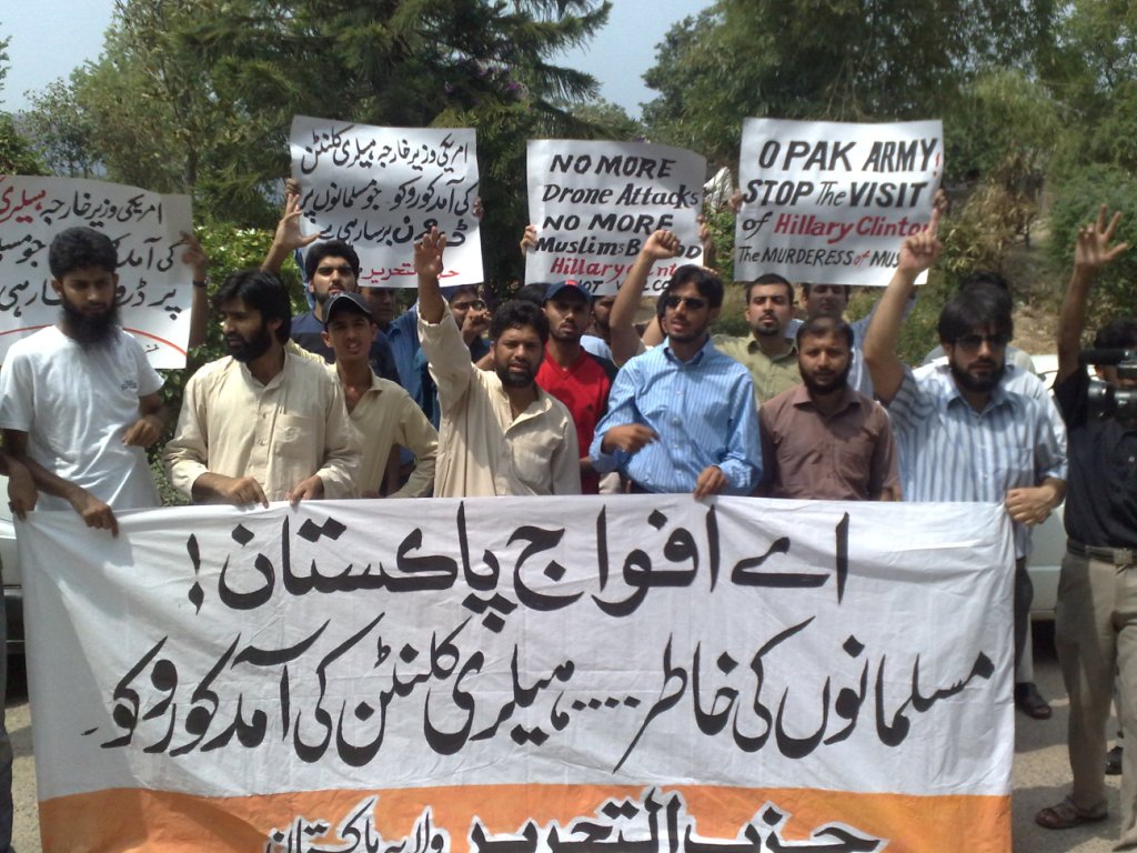 نظم حزب التحرير ولاية باكستان مسيرات في المدن الرئيسية الباكستانية للاحتجاج على زيارة وزيرة خارجية أمريكا هليري كلينتون. وقت اتهم حزب التحرير أمريكا باحتلالها لأفغانستان والعراق ونهب ثروات المسلمين فيهما. حيث قتل من الرجال والنساء والأطفال من اجل أن تمتلئ خزائن الرأسماليين الأمريكان. وطالب المشاركون في المسيرات المسلمين التعامل مع أمريكا كما هي، دولة عدوة. وقالوا بان الخلافة القادمة ستغلق جميع السفارات الأمريكية وتطرد دبلوماسييها وجنودها، وستبدأ بقطع طرق إمدادات النيتو من خلال البلدان الإسلامية كخطوة أولى للتخلص من الوجود الأمريكي من المنطقة.