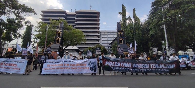 Tausende Muslime demonstrierten am 18. und 19. Oktober 2025 in verschiedenen indonesischen Städten unter dem Motto „Palästina ist weiterhin besetzt“. In Bandung versammelten sich über 15.000 Demonstranten vor dem Gedung-Sati-Gebäude und schwenkten Raya-Flaggen mit dem islamischen Glaubensbekenntnis (Schahada) sowie Schilder mit Slogans wie „Schickt die islamischen Armeen, befreit Palästina!“, „Die endgültige Lösung für Palästina liegt im Dschihad und im Kalifat“ und „Palästina wird durch das Kalifat und den Dschihad befreit werden“.