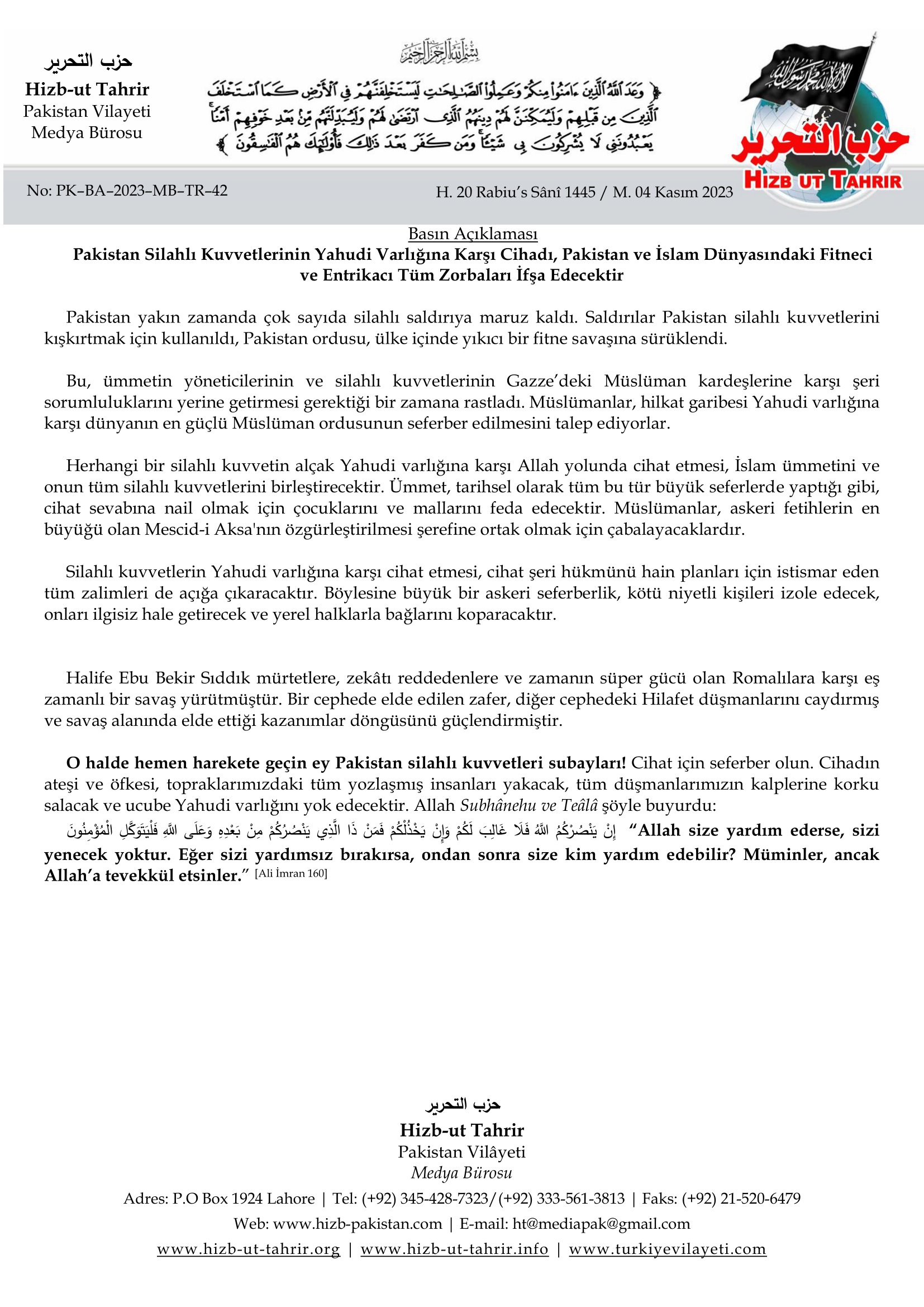 Fax: +(92) 21–520–6479 E-Mail: spokesman@hizb-ut-tahrir.com.pk |