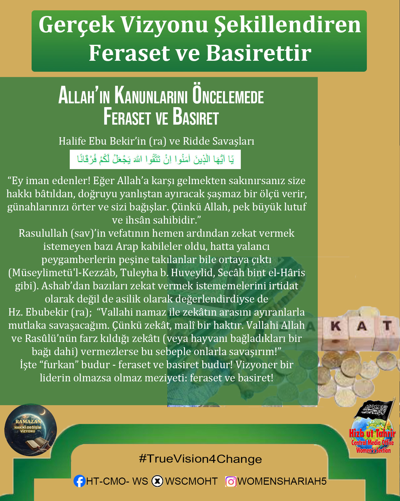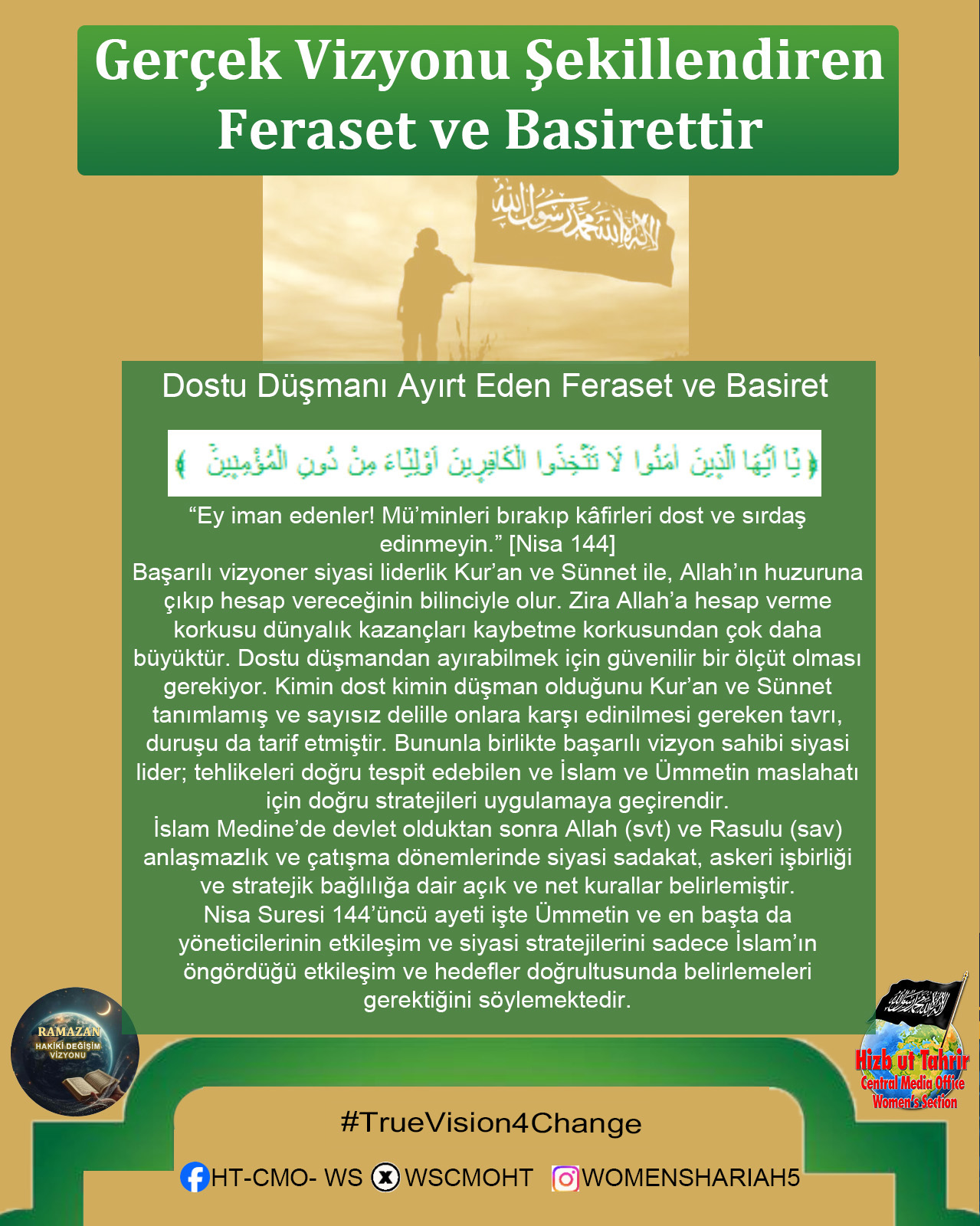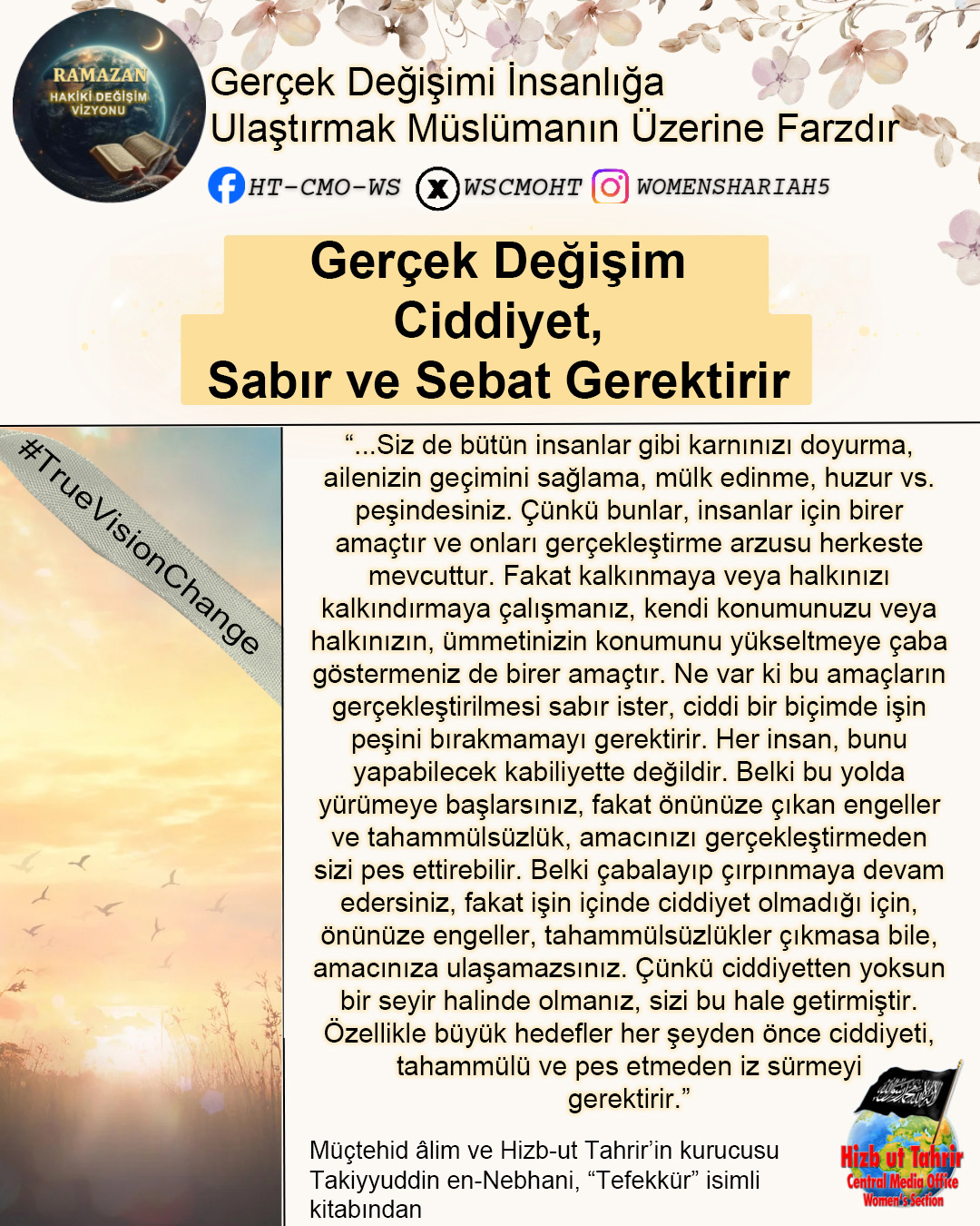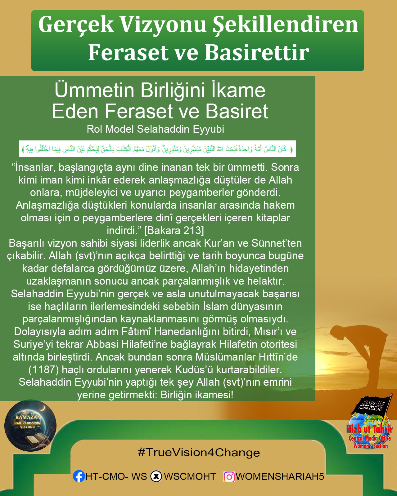 Ramazan ayı, İslam’ın Kur’an ve Sünnetin içerdiği hidayet ve vizyon doğrultusunda dünyayı değiştirmek ve insanlığın sorunlarını çözmek için gönderildiğini hatırlama dönemidir. Bugün İslam Ümmetinin ve tüm insanlığın maruz kaldığı zulümler, haksızlıklar, sayısız krizler ve sorunlar dünyanın her zamankinden daha çok İslam’ın sunduğu başarılı değişim vizyonuna muhtaç olduğunu bariz bir şekilde ortaya koymaktadır. Mevcut devletlerin, küresel kuruluşların, uluslararası kurumların halkların sorunlarını çözecek sahih, sürdürülebilir, başarılı ve doğru çözümler üretemedikleri veya soykırımları, işgalleri ve kitlesel zulümleri durduramadıkları kanıtlanmış bir gerçektir. Dolayısıyla bu mübarek Ramazan ayı Kur’an ve Sünnetin insanlık için ortaya koyduğu gerçek değişim vizyonunu tanıma, bu değişimin nasıl gerçekleştirileceğini ve bu hedefe doğru giderken biz Müslümanlara nasıl bir sorumluluk düştüğünü idrak ve tefekkür etmemizin zamanıdır. Bu Ramazan’da Hizb-ut Tahrir Merkezi Medya Ofisi Kadın Kolları olarak bu mesele üzerinde duracak ve Müslümanlar olarak kendi nefsimizde, İslam Ümmeti olarak nefsimizde, siyasi partilerimizin, ordularımızın içinde ve devlet düzeyinde bu gerçek değişim vizyonunu gerçekleştirmek için sahip olmamız veya değiştirmemiz gereken niteliklerin neler olduğunu, hedefimizin önündeki engelleri ve bunları aşmanın yollarını ele alacağız.