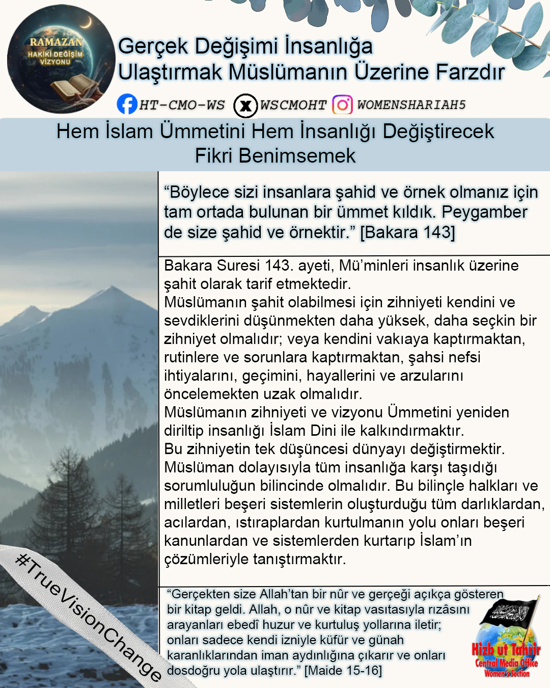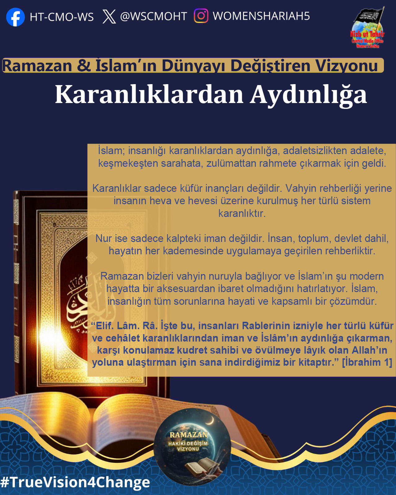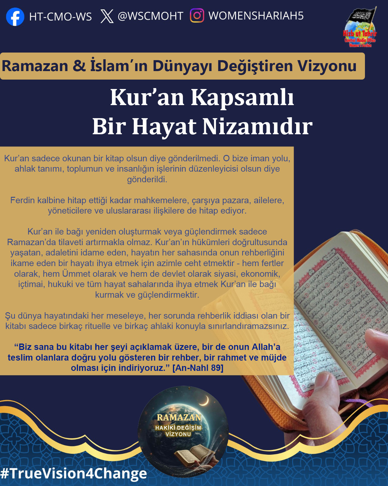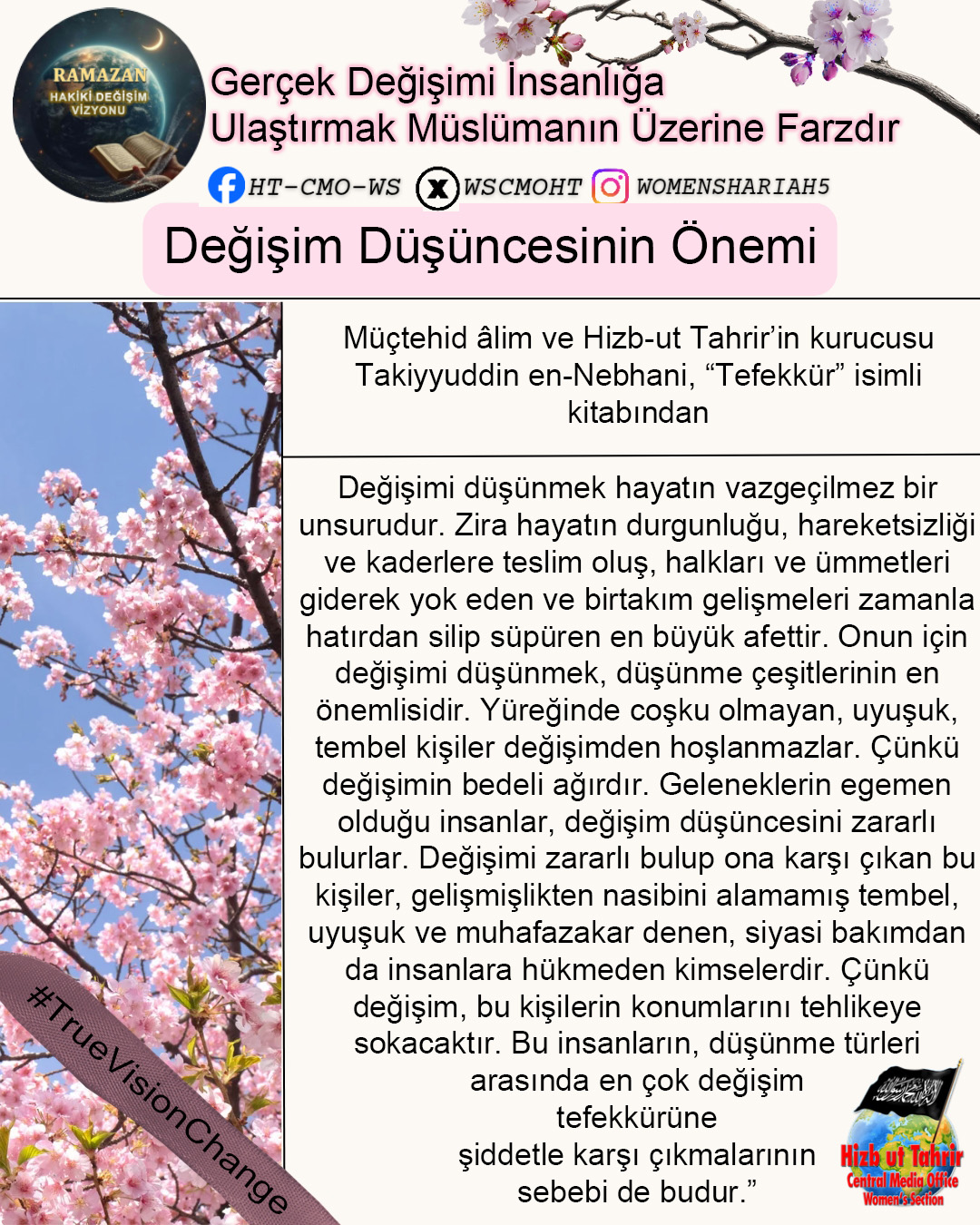Ramazan ayı, İslam’ın Kur’an ve Sünnetin içerdiği hidayet ve vizyon doğrultusunda dünyayı değiştirmek ve insanlığın sorunlarını çözmek için gönderildiğini hatırlama dönemidir. Bugün İslam Ümmetinin ve tüm insanlığın maruz kaldığı zulümler, haksızlıklar, sayısız krizler ve sorunlar dünyanın her zamankinden daha çok İslam’ın sunduğu başarılı değişim vizyonuna muhtaç olduğunu bariz bir şekilde ortaya koymaktadır. Mevcut devletlerin, küresel kuruluşların, uluslararası kurumların halkların sorunlarını çözecek sahih, sürdürülebilir, başarılı ve doğru çözümler üretemedikleri veya soykırımları, işgalleri ve kitlesel zulümleri durduramadıkları kanıtlanmış bir gerçektir. Dolayısıyla bu mübarek Ramazan ayı Kur’an ve Sünnetin insanlık için ortaya koyduğu gerçek değişim vizyonunu tanıma, bu değişimin nasıl gerçekleştirileceğini ve bu hedefe doğru giderken biz Müslümanlara nasıl bir sorumluluk düştüğünü idrak ve tefekkür etmemizin zamanıdır. Bu Ramazan’da Hizb-ut Tahrir Merkezi Medya Ofisi Kadın Kolları olarak bu mesele üzerinde duracak ve Müslümanlar olarak kendi nefsimizde, İslam Ümmeti olarak nefsimizde, siyasi partilerimizin, ordularımızın içinde ve devlet düzeyinde bu gerçek değişim vizyonunu gerçekleştirmek için sahip olmamız veya değiştirmemiz gereken niteliklerin neler olduğunu, hedefimizin önündeki engelleri ve bunları aşmanın yollarını ele alacağız.