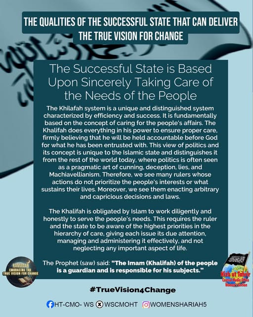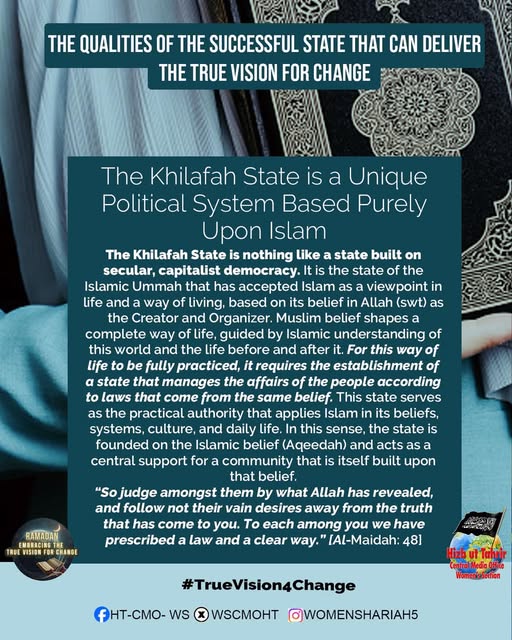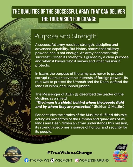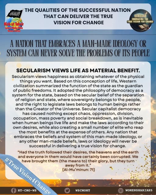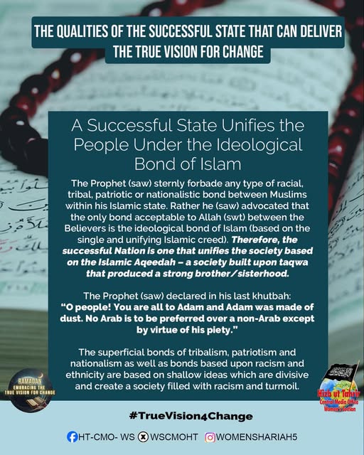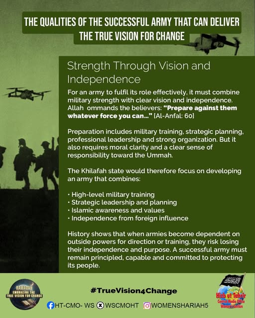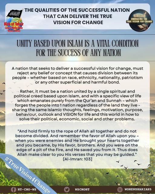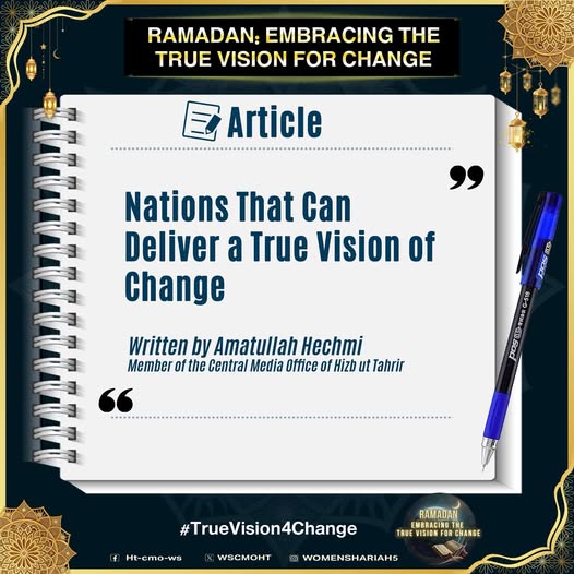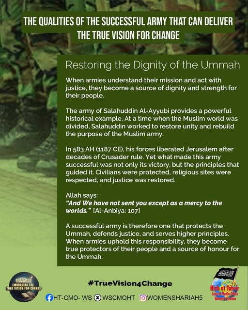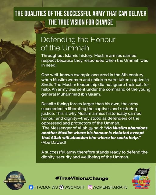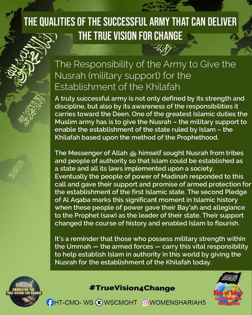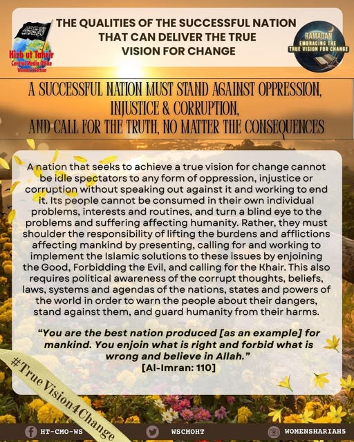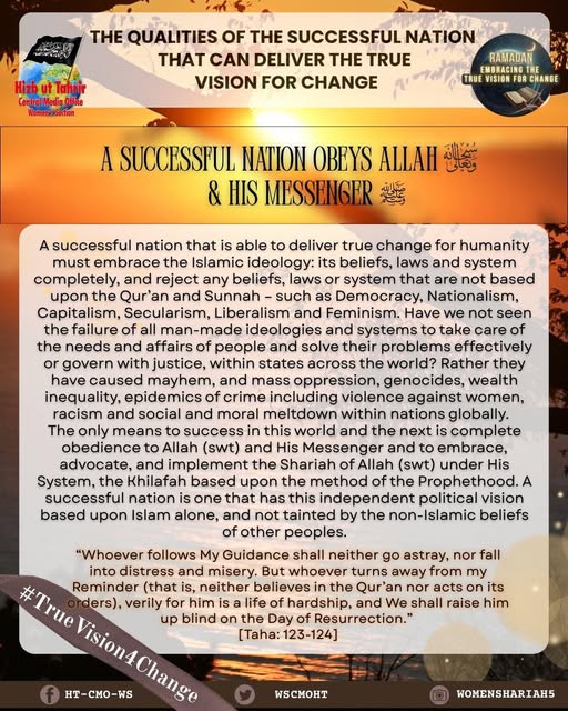 اس بابرکت مہینے میں، حزب التحریر کے مرکزی میڈیا آفس کا خواتین سیکشن اس موضوع پر خطاب کرے گا، جس میں بطور مسلمان، امت اسلامی، ہماری سیاسی جماعتوں، ہماری فوجوں اور ریاستی سطح پر تبدیلی کے اس حقیقی وژن کو حاصل کرنے کے لیے اپنے اندر ضروری خصوصیات اور تبدیلیاں شامل ہیں۔ یہ اس کے حصول کی راہ میں حائل رکاوٹوں اور ان پر قابو پانے کے طریقوں پر بھی بات کرے گا۔