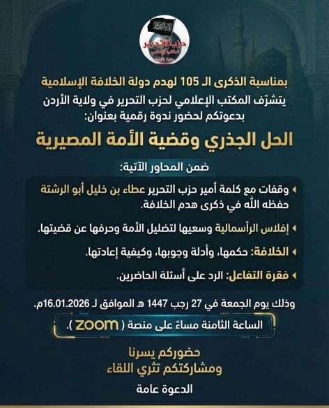 خلافت کی تباہی کی 105 ویں سالگرہ کے موقع پر ولایہ اردن میں حزب التحریر کے میڈیا آفس کو یہ اعزاز حاصل ہوا کہ آپ نے ایک آن لائن سیاسی سیمینارمنظم کیا جس کا عنوان تھا: "بنیادی حل اور امت کا اہم مسئلہ"