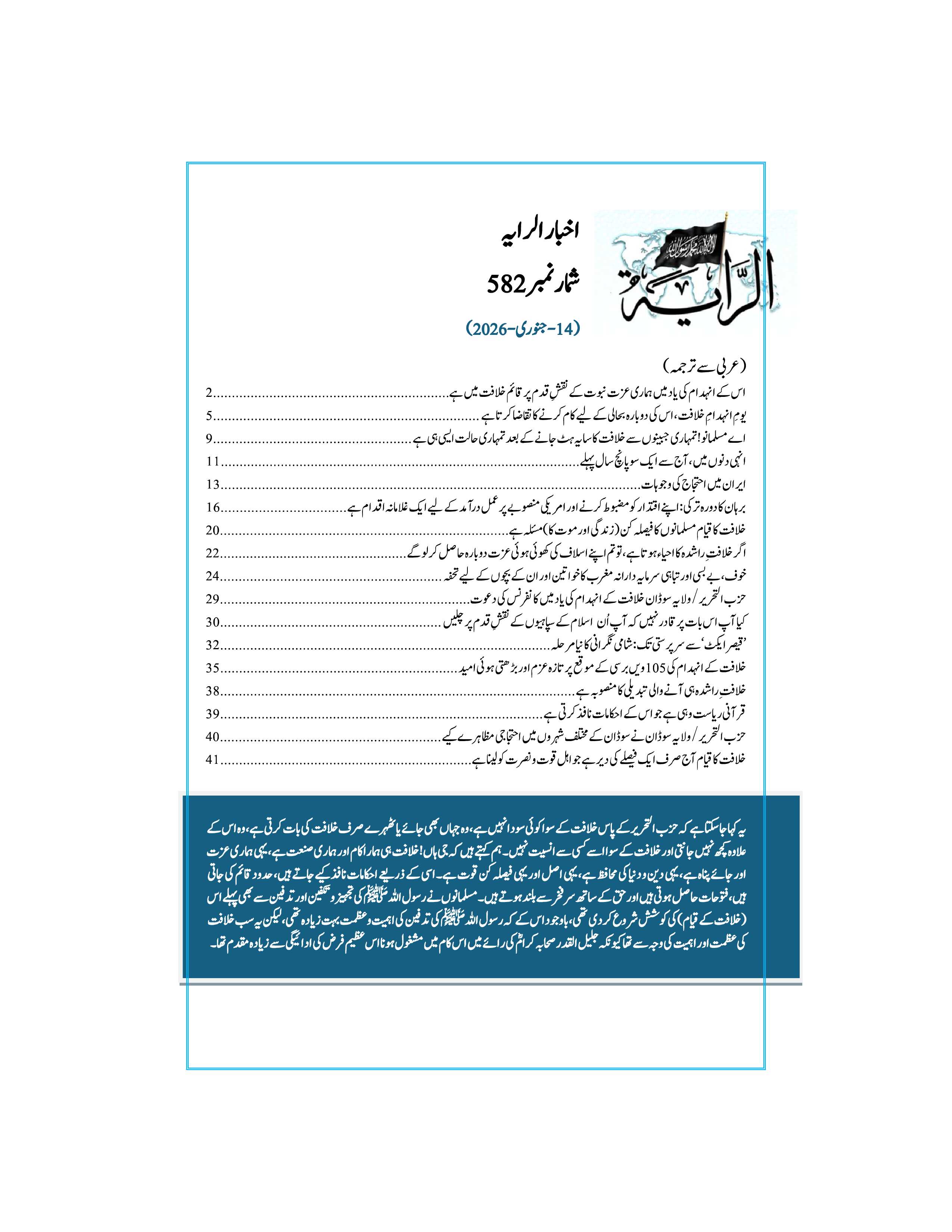 25 من رجب 1447هـ | بدھ, 14 جنوری 2026 سب سے پہلے تبصرہ کرنے والے بنیں فونٹ سائز فونٹ سائز گھٹائیں increase font size بسم الله الرحمن الرحيم رایہ اخبا ر: شمار نمبر582 25 رجب 1447ھ/ 14 جنوری ء2026 پی ڈی ایف کے لئے: یہاں کلک کریں Last modified onبدھ, 14 جنوری 2026 20:39 Latest from وہ ڈھال جو رجب میں کھو گئی حزب التحریر نہ تو کوئی دہشت گرد تنظیم ہے اور نہ ہی صرف وسطی ایشیا تک محدود ہے حزب التحریر کا مرکزی میڈیا آفس رایہ اخبا ر شمار نمبر 581 سقوطِ خلافت کی 105 ویں برسی کے موقع پر حزب التحریر کےامیر More in this category: « رایہ اخبا ر شمار نمبر 581 Leave a comment Make sure you enter the (*) required information where indicated. HTML code is not allowed. Name * ای میل * Website URL Enter the two words you see below Message * آپ کا پیغام یہاں درج کریں ... اوپر کی طرف جائیں