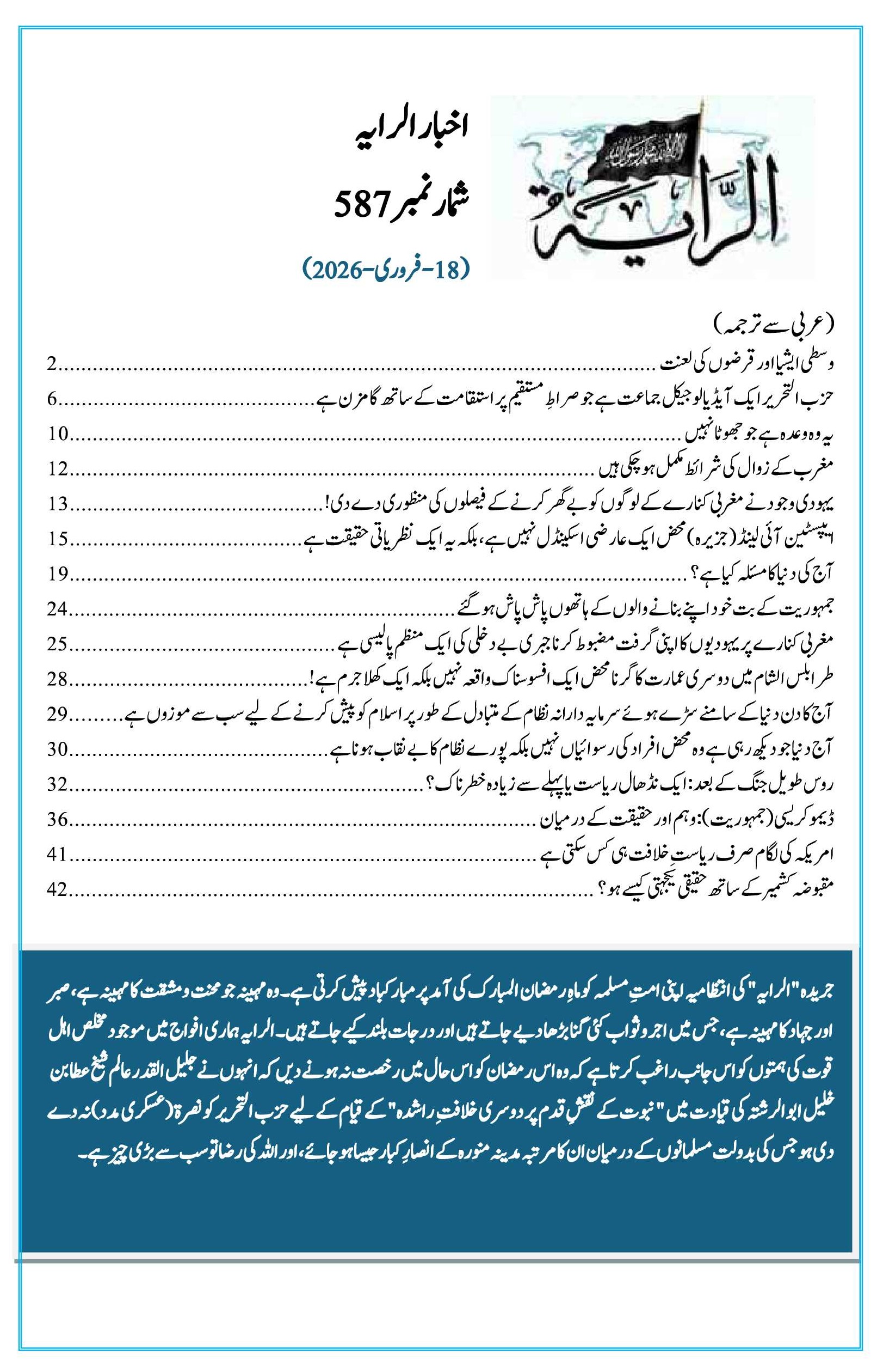 1 من رمــضان المبارك 1447هـ | ہفتہ, 21 فروری 2026 سب سے پہلے تبصرہ کرنے والے بنیں فونٹ سائز فونٹ سائز گھٹائیں increase font size بسم الله الرحمن الرحيم رایہ اخبا ر: شمارہ نمبر587 ویب سائٹ پی ڈی ایف کے لئے: یہاں کلک کریں یکم رمضان 1447ھ - 18 فروری 2026ء Last modified onہفتہ, 21 فروری 2026 00:45 Latest from الرایہ کے متفرقات – شمارہ نمبر 587 آج کی دنیا کا مسئلہ کیا ہے؟ مغربی کنارے پر یہودیوں کا اپنی گرفت مضبوط روس طویل جنگ کے بعد: ایک نڈھال ریاست یا پہلے سے زیادہ خطرناک؟ حزب التحریر ایک آیڈیالوجیکل جماعت ہے More in this category: « حزب التحریر کے مرکزی میڈیا آفس نے ارایہ اخبار کا دوبارہ آغاز کیا Leave a comment Make sure you enter the (*) required information where indicated. HTML code is not allowed. Name * ای میل * Website URL Enter the two words you see below Message * آپ کا پیغام یہاں درج کریں ... اوپر کی طرف جائیں