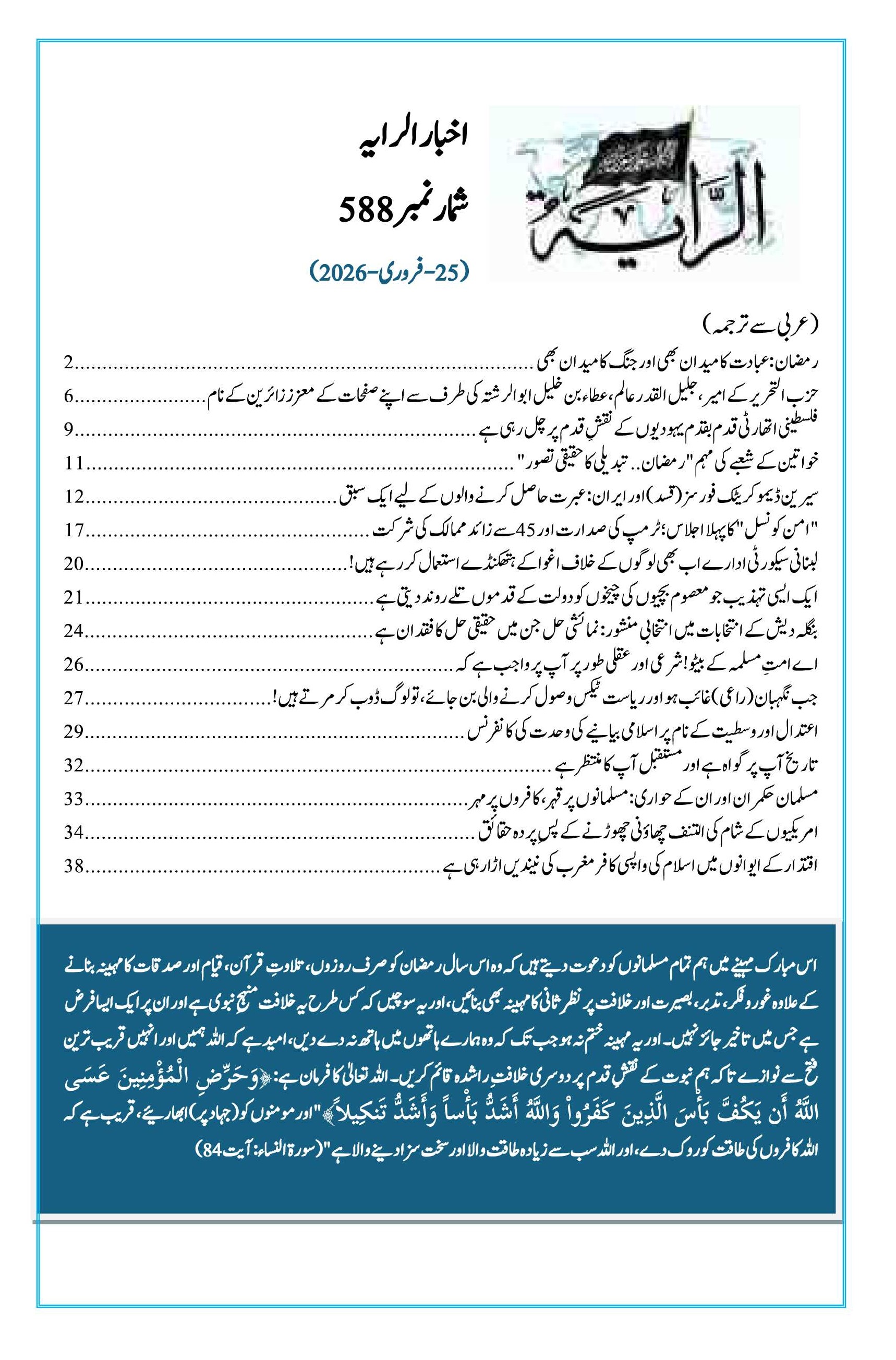 8 من رمــضان المبارك 1447هـ | بدھ, 25 فروری 2026 سب سے پہلے تبصرہ کرنے والے بنیں فونٹ سائز فونٹ سائز گھٹائیں increase font size بسم الله الرحمن الرحيم رایہ اخبا ر شمارہ نمبر588 ویب سائٹ پی ڈی ایف کے لئے: یہاں کلک کریں 8 رمضان 1447ھ - 25 فروری 2026ء Last modified onبدھ, 25 فروری 2026 21:56 Latest from مقبوضہ کشمیر کو پاکستانی مسلح افواج کے متحرک ہونے کی ضرورت ہے! الرایہ اخبار: شمارہ 588 کی نمایاں سرخیاں بے شک خلیفہ ڈھال ہے، جس کے پیچھے رہ کر جنگ کی جاتی ہے متفرقات الراية – شمارہ نمبر 588 امریکیوں کے شام کی التنف چھاؤنی چھوڑنے کے پسِ پردہ حقائق More in this category: « رایہ اخبا ر شمارہ نمبر 587 Leave a comment Make sure you enter the (*) required information where indicated. HTML code is not allowed. Name * ای میل * Website URL Enter the two words you see below Message * آپ کا پیغام یہاں درج کریں ... اوپر کی طرف جائیں
