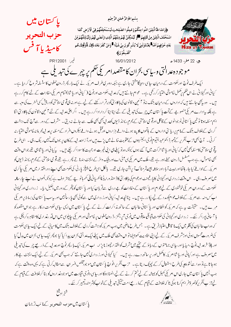 ایک طرف فوج اور حکومت کے درمیان سیاسی دھینگا مشتی جاری ہے جبکہ دوسری طرف امریکہ نے ایک بار پھر ڈرون حملوں کا سلسلہ شروع کر دیا ہے۔ کیانی اور گیلانی نے اس ظلم پر مکمل خاموشی اختیار کر رکھی ہے۔ عوام جانتے ہیں کہ عدلیہ، حکومت اور فوج (کیانی اور پاشا) تمام امریکی مفادات کے لئے کام کر رہے ہیں۔ وہ یہ بھی جانتے ہیں کہ اداروں کے درمیان جنگ نہ تو آئین و قانون کی بالادستی کو برقرار رکھنے کے لیے ہے اور نہ ہی قومی سلامتی کو درپیش کسی خطرے کی وجہ سے ہے بلکہ یہ ادارے امریکی منصوبے کے تحت پاکستان میں چہرے کی تبدیلی کے لئے اپنا اپنا کردار ادا کر رہے ہیں۔ اگر اعلیٰ عدلیہ کے لئے آئین و قانون کی بالادستی اتنا اہم مسئلہ ہوتا تو تین پاکستانی نوجوانوں کے قاتل اور قومی سلامتی کے مجرم ریمنڈ ڈیوس کو عدلیہ کبھی بھی ملک سے جانے نہ دیتی۔ مشرف کے دور سے آج تک دہشت گردی کے خلاف جنگ کے نام پرریاستی اداروں کے ہاتھوں لاپتہ ہونے والے ہزاروں اور قتل ہونے والے سیکڑوں افراد کے مسئلہ پر عدلیہ مجرمانہ خاموشی اختیارنہ کرتی۔ آج بھی حزب التحریر کے ممبر ڈاکٹر عبدالقیوم فوجی ایجنسیوں کے عقوبت خانے میں پڑے ہیں اور آزاد عدلیہ کے کان پر جوں تک نہیں رینگ رہی۔ اسی طرح یہ قومی سلامتی کا مسئلہ بھی نہیں کہ کیانی اور پاشا حرکت میں آگئے ہوں کیونکہ وہ تو پہلے ہی اپنی غیرت اور حمیت کا سودا کر چکے ہیں۔ یہ کیانی اور پاشا ہی تھے جو اس وقت بھی خاموش رہے جب مسلسل ڈرون حملے ہو رہے تھے، ملک میں امریکی سی آئی اے اور بلیک واٹر کے ایجنٹ دندناتے پھر رہے تھے، قومی سلامتی کے مجرم ریمنڈڈیوس کو امریکہ کے حوالے کیا جا رہا تھا اور ایبٹ آباد اور سلالہ جیسے شرمناک آپریشن جاری تھے۔ بالکل اسی طرح پیپلز پارٹی کی حکومت بھی اپنے دور اقتدار میں امریکی چاکری میں مصروف رہی۔ اس وقت زرداری اور گیلانی کا پارلیمنٹ اور عوام کی بالادستی کا ڈھنڈورا پیٹنا کھسیانی بلی کھمبا نوچے کے مترادف ہے کیونکہ انھوں نے اپنے چار سالہ حکومت کے دوران امریکی خوشنودی کے لیے عوام اور پاکستان کے مفادات کو بے دردی سے قربا ن کیا اور پاکستان کو پتھر کے دور میں دھکیل دیا۔ زردارری اور گیلانی اب کس منہ سے امریکہ کے خلاف عوام کو مدد کے لیے پکار رہے ہیں۔ چنانچہ عدلیہ، کیانی اور زرداری میں سے کوئی بھی پارسا نہیں اور یہ سب پاکستان کی بساط پر امریکی مہرے ہیں۔