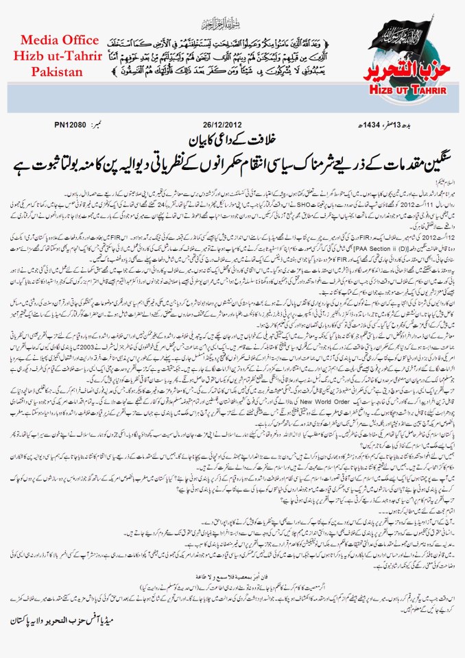 3. عدلیہ سے کہ وہ نہ صرف ان جھوٹے مقدمات کی عدالتی تحقیقات کا حکم دے بلکہ اس نوٹیفیکیشن کو کالعدم قرار دے جو حزب التحریر پراس غیر منصفانہ پابندی کا سبب ہے۔