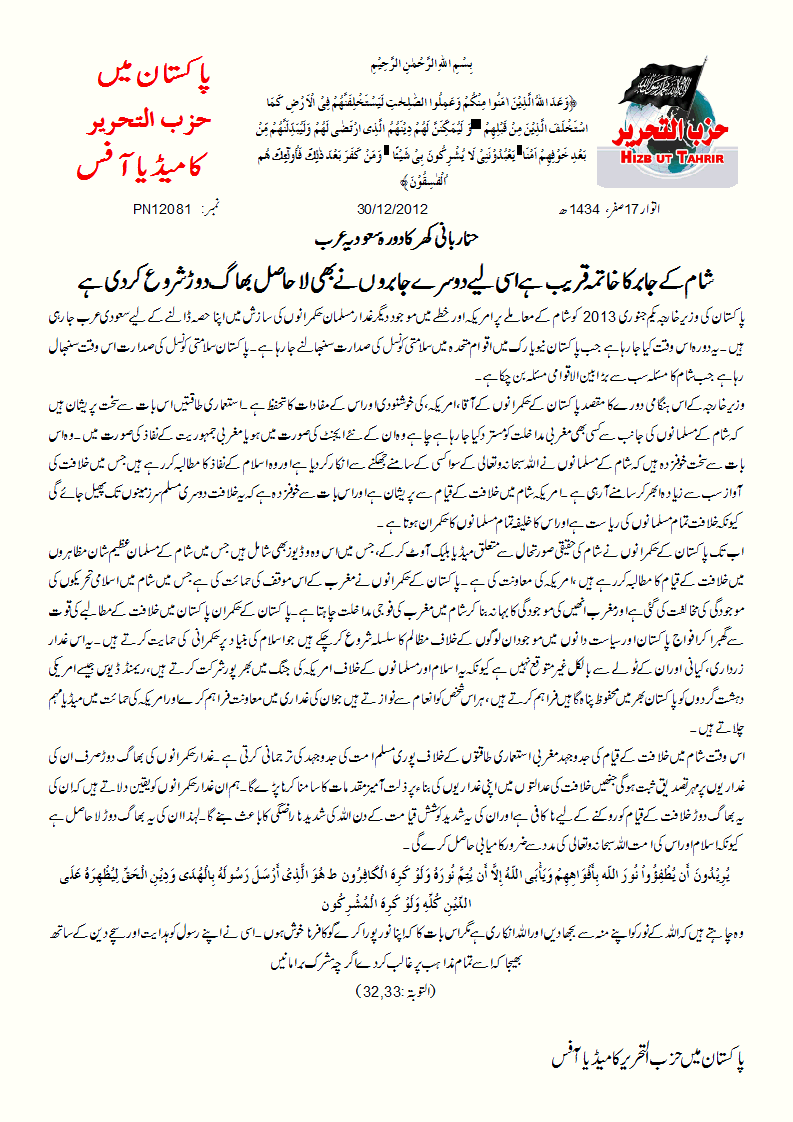اب تک پاکستان کے حکمرانوں نے شام کی حقیقی صورتحال سے متعلق میڈیا بلیک آوٹ کر کے، جس میں اس وہ وڈیوز بھی شامل ہیں جس میں شام کے مسلمان عظیم شان مظاہروں میں خلافت کے قیام کا مطالبہ کر رہے ہیں، امریکہ کی معاونت کی ہے۔ پاکستان کے حکمرانوں نے مغرب کے اس موقف کی حمائت کی ہے جس میں شام میں اسلامی تحریکوں کی موجودگی کی مخالفت کی گئی ہے اور مغرب انھیں کی موجودگی کا بہانہ بنا کر شام میں مغرب کی فوجی مداخلت چاہتا ہے۔ پاکستان کے حکمران پاکستان میں خلافت کے مطالبے کی قوت سے گھبرا کر افواج پاکستان اور سیاست دانوں میں موجود ان لوگوں کے خلاف مظالم کا سلسلہ شروع کر چکے ہیں جو اسلام کی بنیاد پر حکمرانی کی حمایت کرتے ہیں۔ یہ اس غدار زرداری، کیانی اور ان کے ٹولے سے بالکل غیر متوقع نہیں ہے کیونکہ یہ اسلام اور مسلمانوں کے خلاف امریکہ کی جنگ میں بھر پور شرکت کرتے ہیں، ریمنڈ ڈیوس جیسے امریکی دہشت گردوں کو پاکستان بھر میں محفوظ پناہ گاہیں فراہم کرتے ہیں، ہر اس شخص کو انعام سے نوازتے ہیں جو ان کی غداری میں معاونت فراہم کرے اور امریکہ کی حمائت میں میڈیا مہم چلاتے ہیں۔