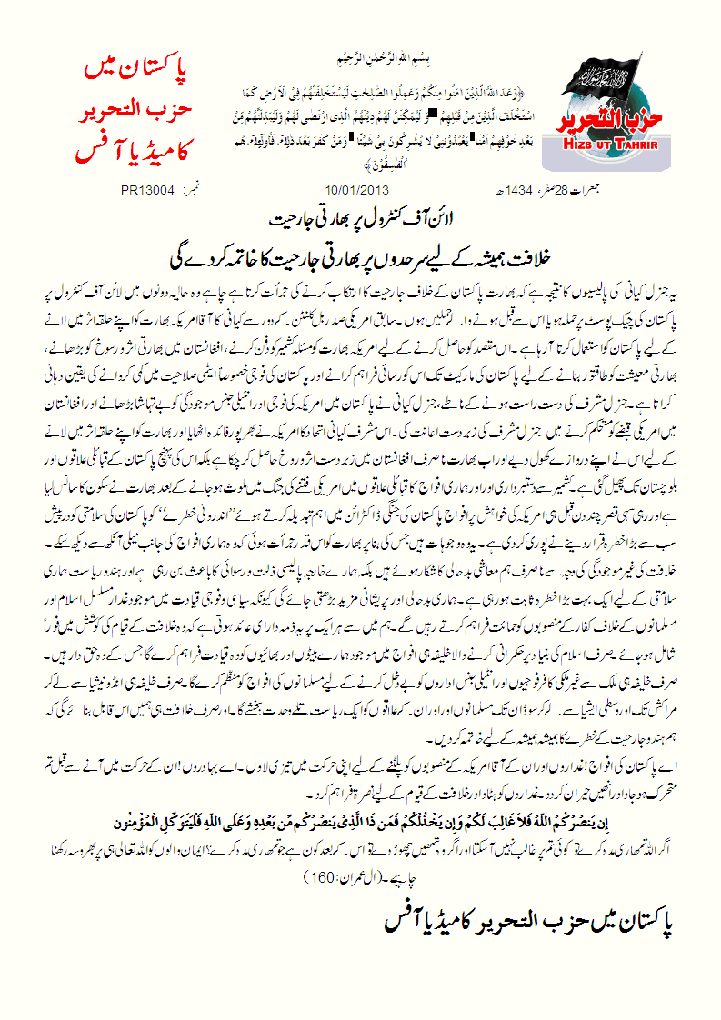 خلافت کی غیر موجودگی کی وجہ سے ناصرف ہم معاشی بد حالی کا شکار ہوئے ہیں بلکہ ہمارے خارجہ پالیسی ذلت و رسوائی کا باعث بن رہی ہے اور ہندو ریاست ہماری سلامتی کے لیے ایک بہت بڑا خطرہ ثابت ہو رہی ہے۔ ہماری بدحالی اور پریشانی مزید بڑھتی جائے گی کیونکہ سیاسی و فوجی قیادت میں موجود غدار مسلسل اسلام اور مسلمانوں کے خلاف کفار کے منصوبوں کو حمائت فراہم کرتے رہیں گے۔ ہم میں سے ہر ایک پر یہ ذمہ دارای عائد ہوتی ہے کہ وہ خلافت کے قیام کی کوشش میں فوراً شامل ہو جائے۔ صرف اسلام کی بنیاد پر حکمرانی کرنے والا خلیفہ ہی افواج میں موجود ہمارے بیٹوں اور بھائیوں کو وہ قیادت فراہم کرے گا جس کے وہ حق دار ہیں۔ صرف خلیفہ ہی ملک سے غیر ملکی کافر فوجیوں اور انٹیلی جنس اداروں کو بے دخل کرنے کے لیے مسلمانوں کی افواج کو منظم کرے گا۔ صرف خلیفہ ہی انڈونیشیا سے لے کر مراکش تک اور وسطی ایشیا سے لے کر سوڈان تک مسلمانوں اور اور ان کے علاقوں کو ایک ریاست تلے وحدت بخشے گا۔ اور صرف خلافت ہی ہمیں اس قابل بنائے گی کہ ہم ہندو جارحیت کے خطرے کا ہمیشہ ہمیشہ کے لیے خاتمہ کر دیں۔