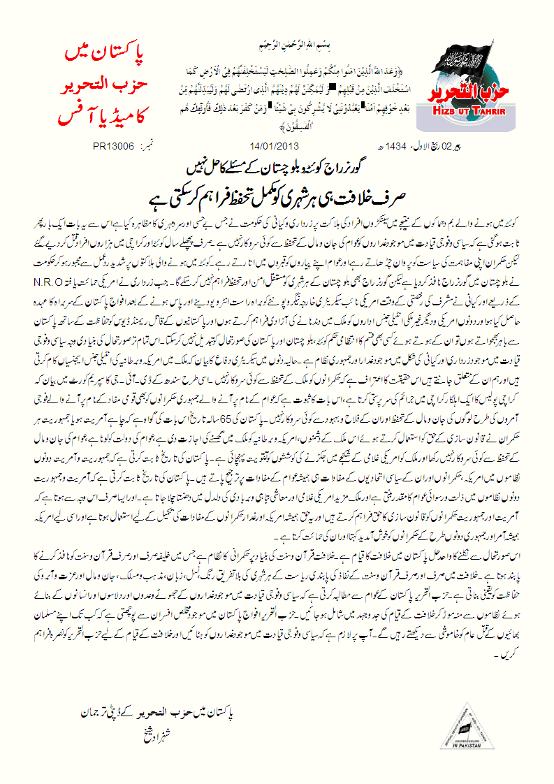 گورنر راج کوئٹہ و بلوچستان کے مسئلے کا حل نہیں صرف خلافت ہی ہر شہری کو مکمل تحفظ فراہم کر سکتی ہے