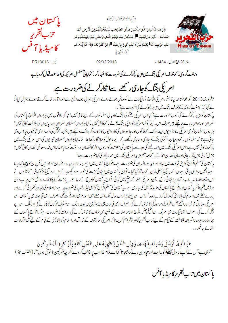 پاکستان کو مزید کچھ کرنے کی کیوں ضرورت ہے؟کیا اس امریکی فتنے کی جنگ کا وبال مسلمانوں کے لیے کافی نہیں!قبائلی علاقوں میں ہزاروں افواج پاکستان کی افسران اور جوان مارے جاچکے ہیں صرف اس لیے کیونکہ امریکہ خود اپنی جنگ لڑنے کے قابل نہیں۔ کیا ہزاروں مسلمان افسران اور سپاہیوں کی ہلاکت کافی نہیں؟ ہزاروں مسلمان شہری امریکی ریمنڈ ڈیوس نیٹ ورک کے قاتلوں اور جاسوسوں کی کاروائیوں کا شکار ہو کر ہلاک ہو چکے ہیں جن کے قتل کی ذمہ داری قبائلیوں پر ڈال دی جاتی ہے تا کہ مسلمانوں کے درمیان فتنے کی جنگ کو جاری و ساری رکھنے کے لیے ماحول کو سازگار رکھا جائے۔ کیا ہزاروں مسلمان شہریوں کی اس امریکی جنگ میں ہلاکت کافی نہیں ہے؟ اس امریکی جنگ میں حصہ لینے کی وجہ سے پاکستان کی معیشت کو اربوں ڈالر کا نقصان برداشت کرنا پڑا۔ کیا اس قدر معاشی نقصان کافی نہیں؟ جنرل کیانی !اس قدر جانی اور مالی نقصان اٹھانے کے بعد آخر مزید امریکی جنگ میں حصہ لینے کی کیا ضرورت ہے؟