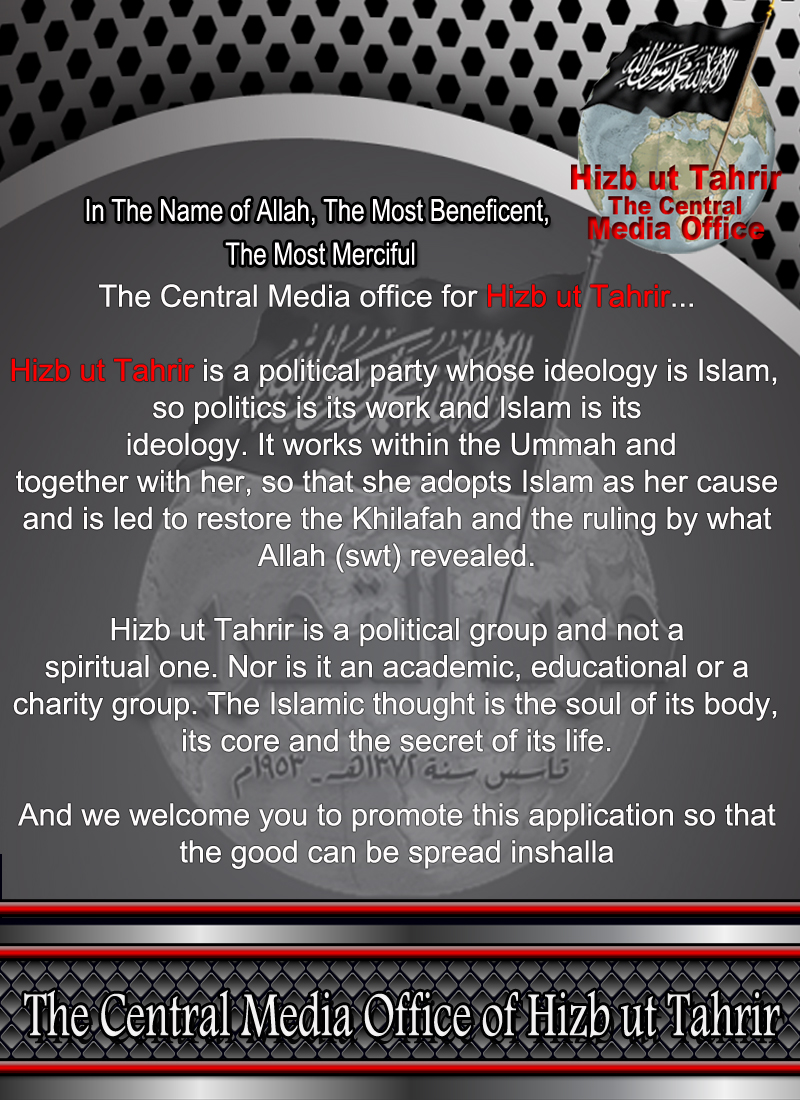 We, at the Central Media Office of Hizb ut Tahrir, are pleased to present our followers and visitors of the Central Media Office with the very first of its kind - the CMO App for your Android devices created by the Technical Dept at the Central Media Office of Hizb ut Tahrir. We welcome the long awaited application to spread the good, Inshallah.