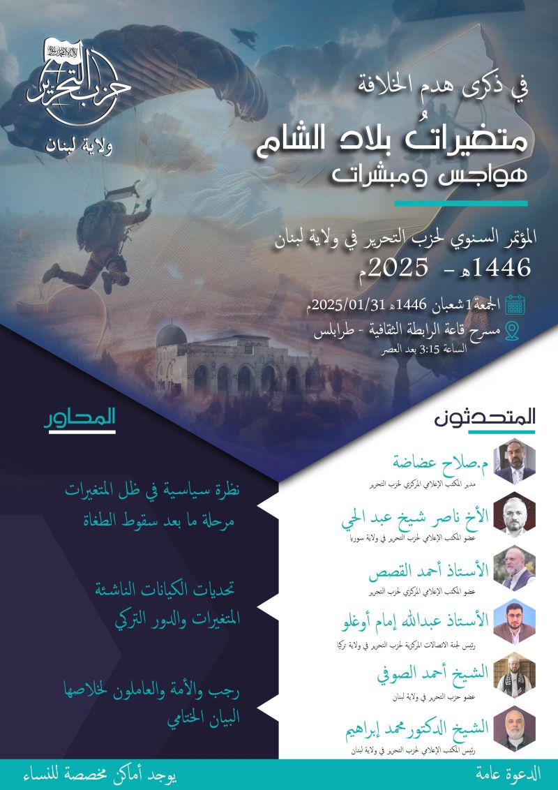 Kwa mnasaba wa kumbukumbu ya miaka 104 Hijria ya kuvunjwa dola ya Kiislamu (Khilafah) mnamo tarehe 28 Rajab Tukufu mwaka 1342 H sawa na 03/03/1924 M mikononi mwa wahalifu wa Kiarabu na Kituruki, na kwa kuzingatia mabadiliko na mishtuko mikali inayotokea ndani na karibu na ardhi ya Ash-Sham, Hizb ut Tahrir/Wilayah Lebanon inaandaa kongamano lenye kichwa: