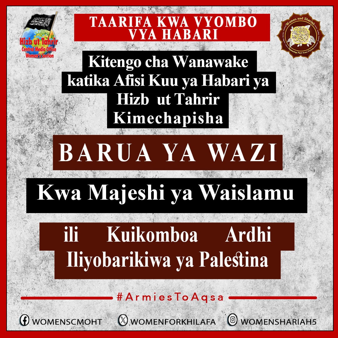 Enyi Watu Wenye Nguvu katika Majeshi ya Waislamu! Kama wanawake wa Umma huu mtukufu wa Kiislamu, tunatoa wito kwenu, tukisihi Imani yenu na hali ya heshima! Inukeni na mupindue viti vya watawala hawa wasaliti waoga na futeni mipaka hii batili ya ukoloni yenye kugawanya kati ya ardhi zetu, na tembeeni hadi Al Quds kwa ajili ya kuwalinda mama zenu na watoto wenu wa Palestina. Igeni matendo ya kamanda mkuu wa Khilafah ya Umayyah, Qutayba ibn Muslim, ambaye aliwakamata wale waliowatia hofu wanawake wa Kiislamu na kukataa hazina za dhahabu na fedha zilizotolewa na wakosaji kama fidia ya maisha yao, akitangaza maneno yake maarufu: “Hapana, naapa kwa Mwenyezi Mungu, je mwanamke wa Kiislamu atahangaishwa kwa ajili yenu”! Tunakulinganieni muwaondoe watawala hawa dhalimu na tawala ambazo hazijaleta chochote isipokuwa kukata tamaa na uhdalilifu kwa Ummah huu na kukuzuieni kutekeleza dori yenu ya kweli ya watetezi wa Waislamu. Kateni minyororo ya utawala wao dhalimu na toeni Nusrah yako (msaada wa kimada) kwa ajili ya kusimamisha uongozi wa Kiislamu na mfumo wa Khilafah ambao utawaunganisha Waislamu chini ya mfumo na dola moja inayotekeleza Amri za Mola (Rabb) wenu (swt). Itakuhamasisheni kukomboa kila shubiri ya ardhi ya Waislamu inayokaliwa kwa mabavu na kuwalinda Waislamu, bila kujali wanaishi wapi, na kukufanyeni mashujaa wa Ummah wenu na kuleta heshima kwa jina lenu.